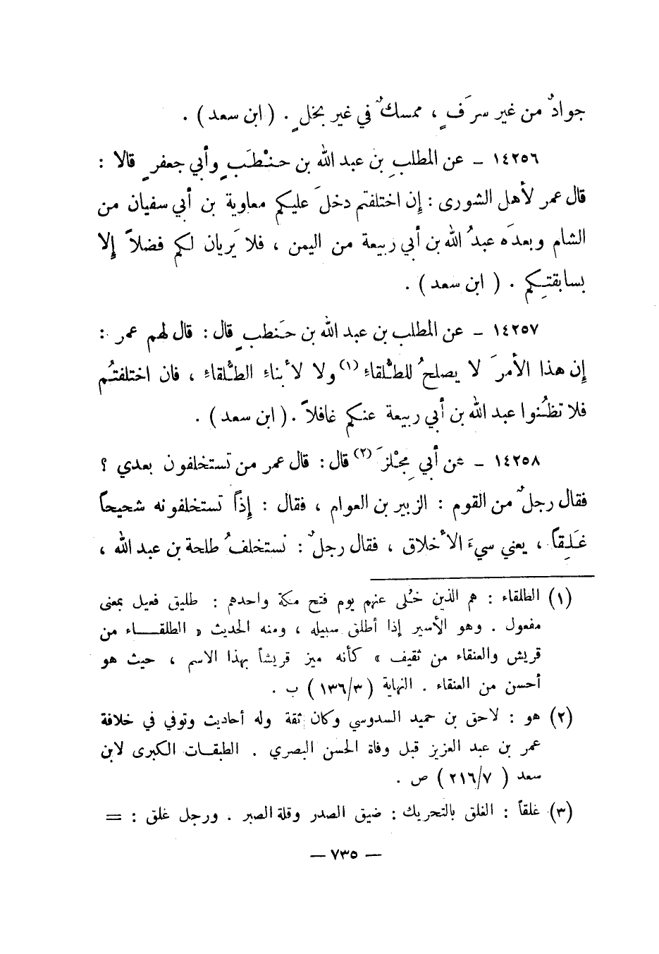 14257- عن المطلب بن عبد الله بن حنطب قال: قال لهم عمر: إن هذا الأمر لا يصلح للطلقاء1 ولا لأبناء الطلقاء، فإن اختلفتم فلا تظنوا عبد الله بن أبي ربيعة عنكم غافلا. "ابن سعد".