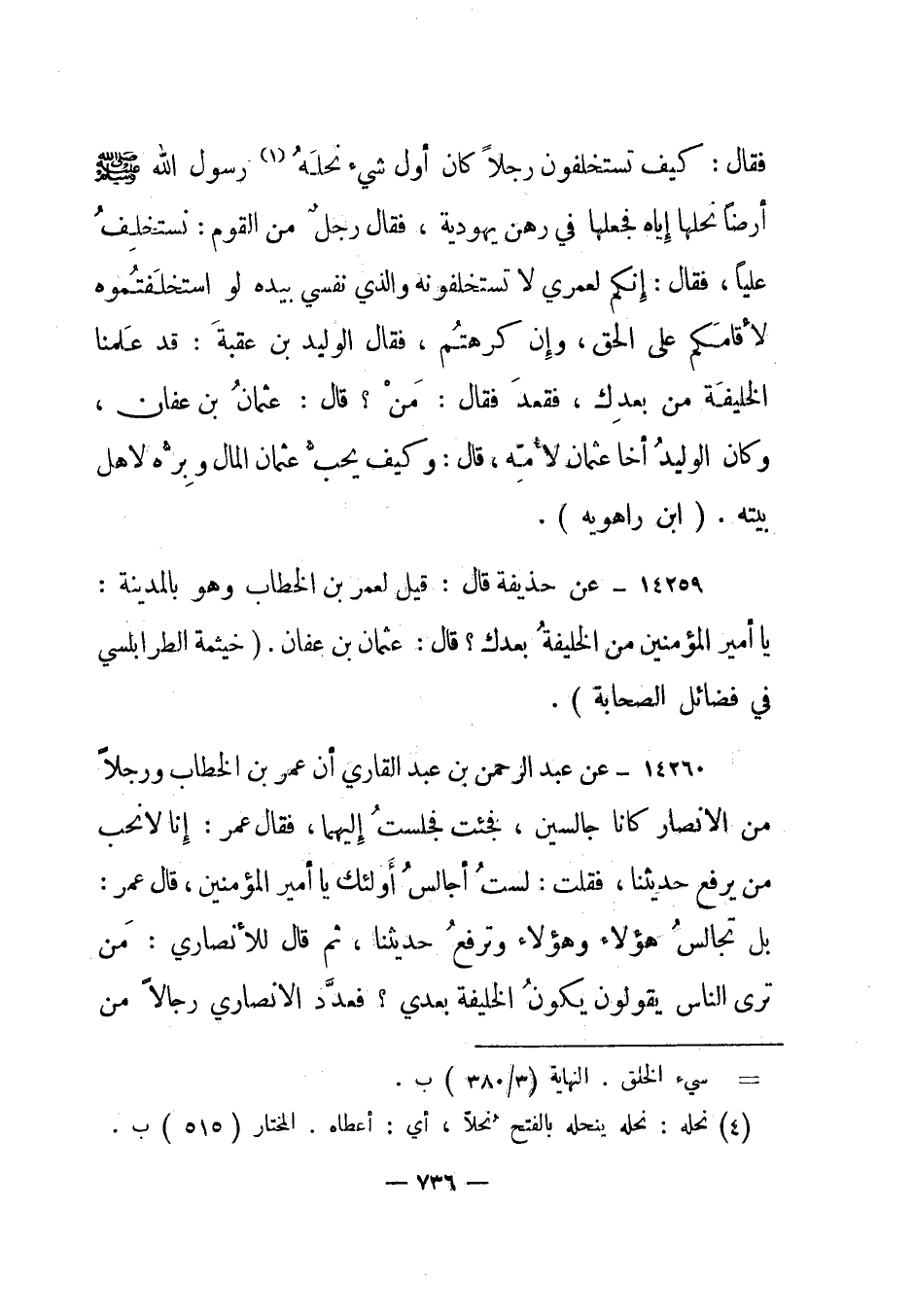 14259- عن حذيفة قال: قيل لعمر بن الخطاب وهو بالمدينة: يا أمير المؤمنين من الخليفة بعدك؟ قال: عثمان بن عفان. "خيثمة الطرابلسي في فضائل الصحابة".