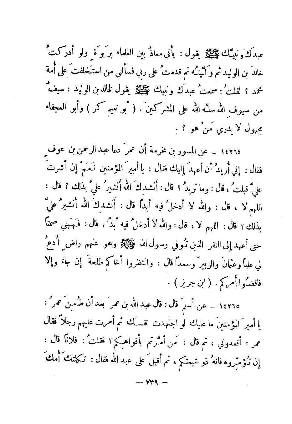 14264- عن المسور بن مخرمة أن عمر دعا عبد الرحمن بن عوف فقال: إني أريد أن أعهد إليك فقال: يا أمير المؤمنين نعم إن أشرت علي قبلت، قال: وما تريد؟ قال: أنشدك الله أتشير علي بذلك؟ قال: اللهم لا، قال: والله لا أدخل فيه أبدا قال: أنشدك الله أتشير علي بذلك؟ قال: اللهم لا، قال: والله لا أدخل فيه أبدا، قال: فهبني صمتا حتى أعهد إلى النفر الذين توفي رسول الله صلى الله عليه وسلم وهو عنهم راض ادع لي عليا وعثمان والزبير وسعدا قال: وانتظروا أخاكم طلحة إن جاء وإلا فاقضوا أمركم. "ابن جرير".