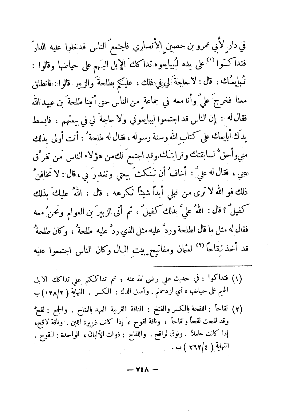 في دار لأبي عمرو بن حصين الأنصاري فاجتمع الناس فدخلوا عليه الدار فتداكوا1 على يده ليبايعوه تداكك الإبل البهم على حياضها وقالوا: نبايعك، قال: لا حاجة لي في ذلك، عليكم بطلحة والزبير قالوا: فانطلق معنا فخرج علي وأنا معه في جماعة من الناس حتى أتينا طلحة بن عبيد الله فقال له: إن الناس قد اجتمعوا ليبايعوني ولا حاجة لي في بيعتهم، فابسط يدك أبايعك على كتاب الله وسنة رسوله، فقال له طلحة: أنت أولى بذلك مني وأحق لسابقتك وقرابتك، وقد اجتمع لك من هؤلاء الناس من تفرق عني، فقال له علي: أخاف أن تنكث بيعتي وتغدر بي، قال: لا تخافن ذلك فوالله لا ترى من قبلي أبدا شيئا تكرهه، قال: الله عليك بذلك كفيل؟ قال: الله علي بذلك كفيل، ثم أتى الزبير بن العوام ونحن معه فقال له مثل ما قال لطلحة ورد عليه مثل الذي رد عليه طلحة، وكان طلحة قد أخذ لقاحا2 لعثمان ومفاتيح بيت المال وكان الناس اجتمعوا عليه