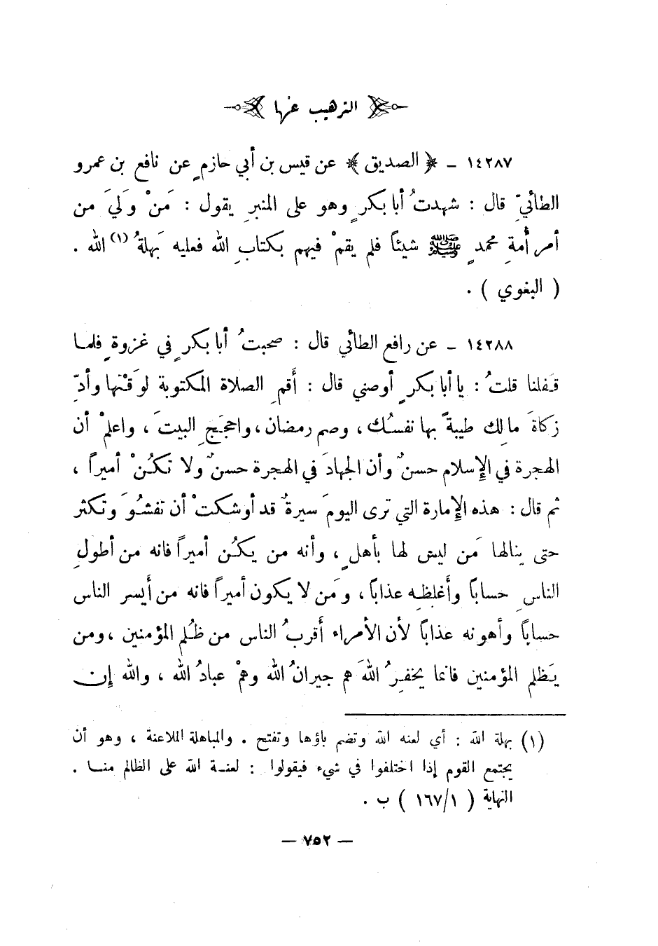14287- "الصديق" عن قيس بن أبي حازم عن نافع بن عمرو الطائي قال: شهدت أبا بكر وهو على المنبر يقول: من ولي من أمر أمة محمد صلى الله عليه وسلم شيئا فلم يقم فيهم بكتاب الله فعليه بهلة1الله. "البغوي".