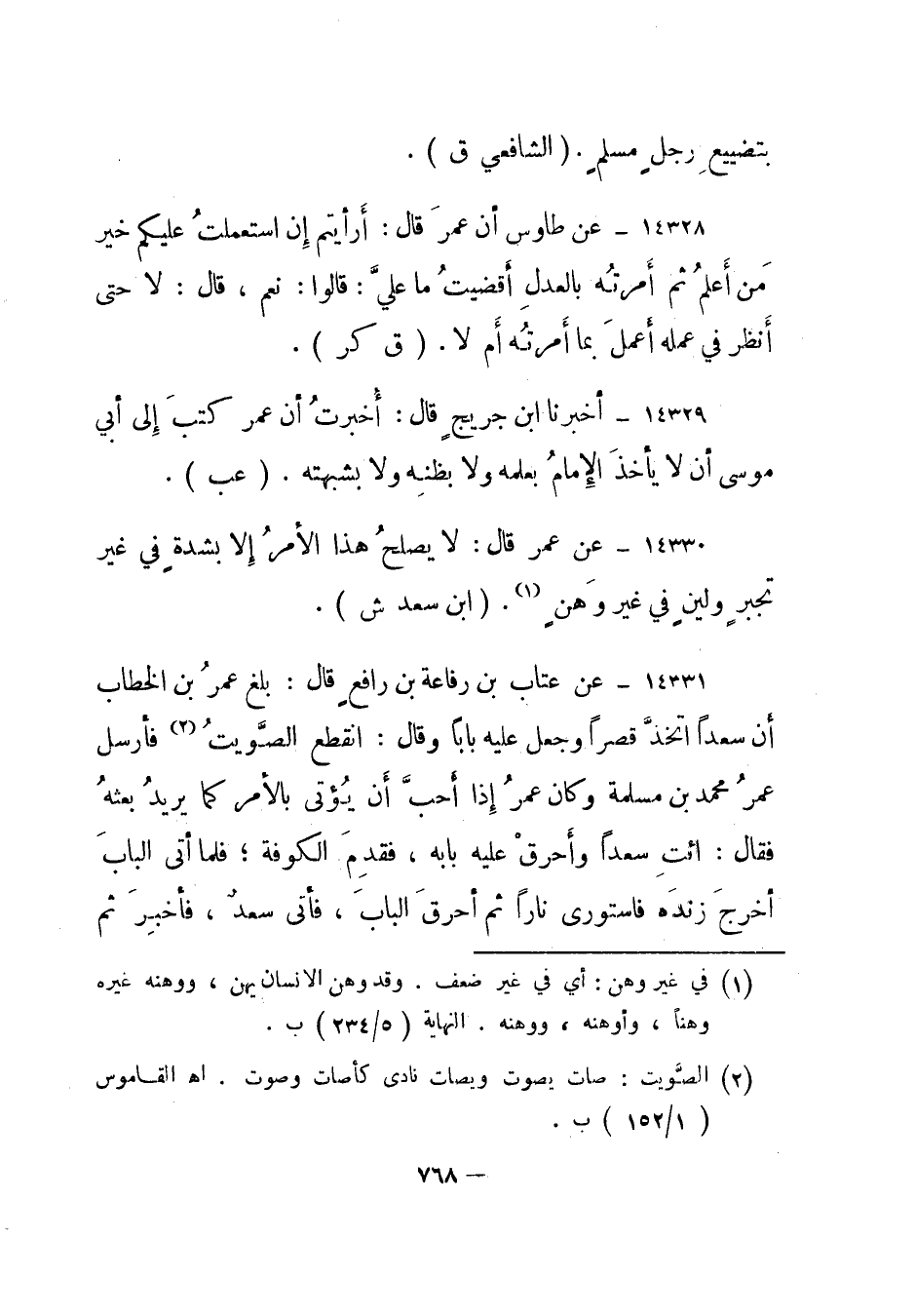 14331- عن عتاب بن رفاعة بن رافع قال: بلغ عمر بن الخطاب أن سعدا اتخذ قصرا وجعل عليه بابا وقال: انقطع الصويت2 فأرسل عمر محمد بن مسلمة وكان عمر إذا أحب أن يؤتى بالأمر كما يريد بعثه فقال: ائت سعدا وأحرق عليه بابه، فقدم الكوفة؛ فلما أتى الباب أخرج زنده فاستورى نارا ثم أحرق الباب، فأتى سعد، فأخبر ثم