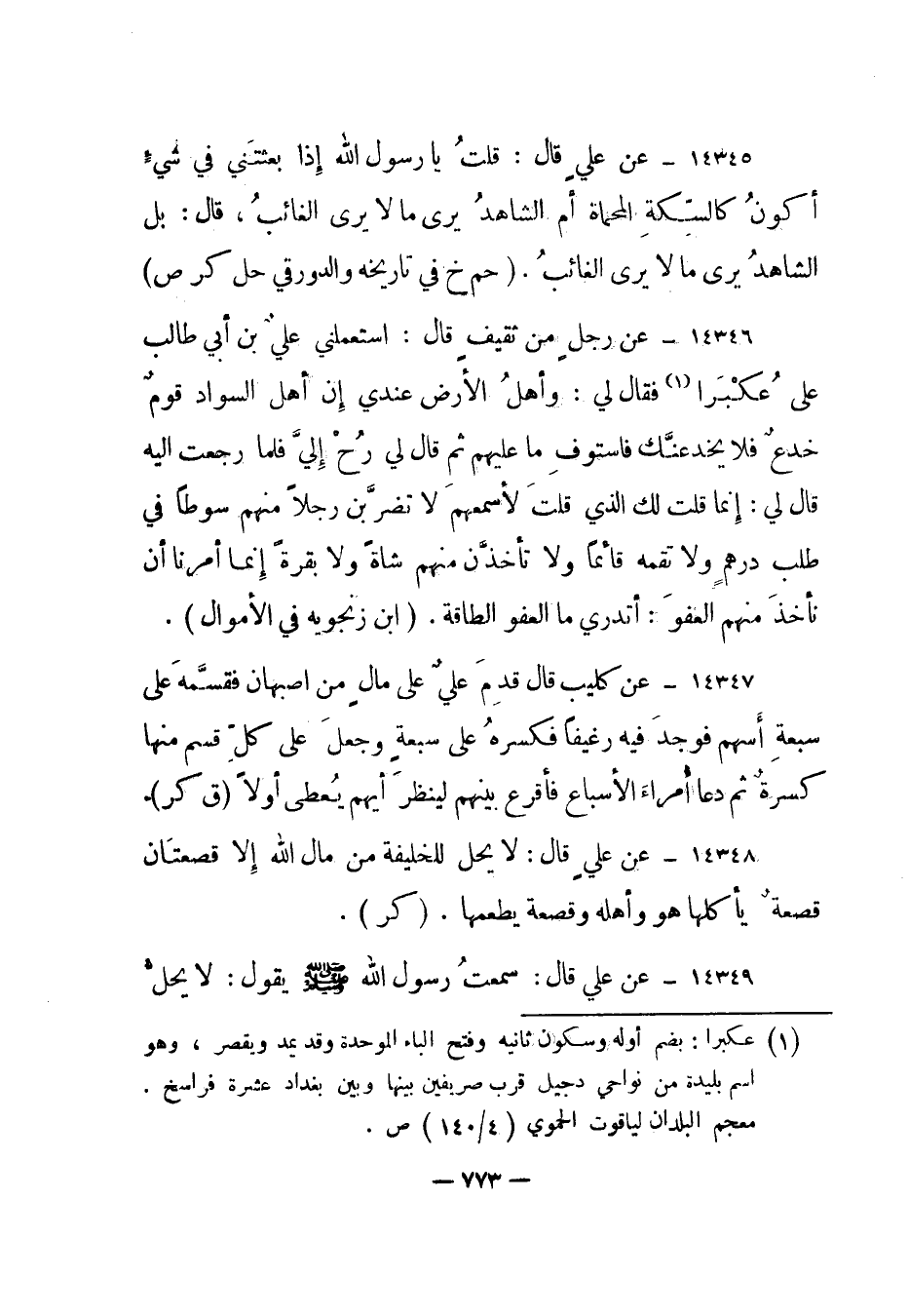 14346- عن رجل من ثقيف قال: استعملني علي بن أبي طالب على عكبرا1 فقال لي: وأهل الأرض عندي إن أهل السواد قوم خدع فلا يخدعنك فاستوف ما عليهم ثم قال لي رح إلي فلما رجعت إليه قال لي: إنما قلت لك الذي قلت لأسمعهم لا تضربن رجلا منهم سوطا في طلب درهم ولا تقمه قائما ولا تأخذن منهم شاة ولا بقرة إنما أمرنا أن نأخذ منهم العفو: أتدري ما العفو الطاقة. "ابن زنجويه في الأموال".