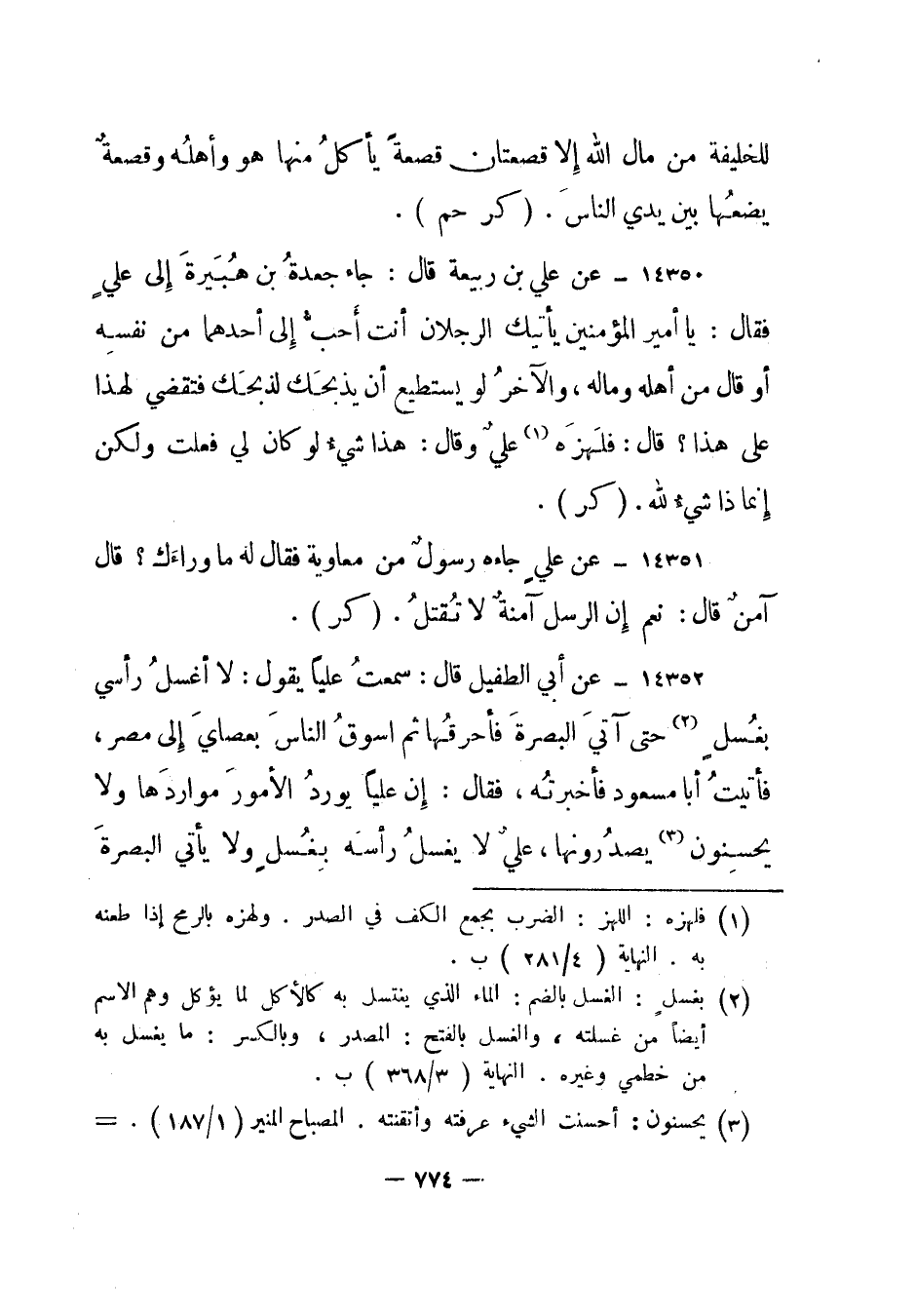 14352- عن أبي الطفيل قال: سمعت عليا يقول: لا أغسل رأسي بغسل2 حتى آتي البصرة فأحرقها ثم أسوق الناس بعصاي إلى مصر، فأتيت أبا مسعود فأخبرته، فقال: إن عليا يورد الأمور مواردها ولا يحسنون3 يصدرونها، علي لا يغسل رأسه بغسل ولا يأتي البصرة