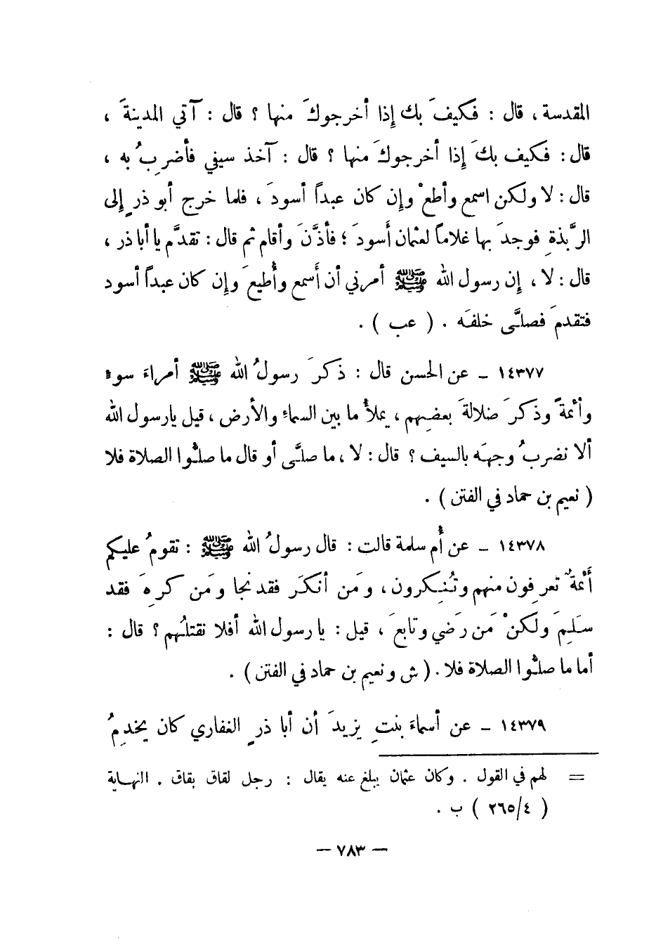 14377- عن الحسن قال: ذكر رسول الله صلى الله عليه وسلم أمراء سوء وأئمة وذكر ضلالة بعضهم، يملأ ما بين السماء والأرض، قيل يا رسول الله ألا نضرب وجهه بالسيف؟ قال: لا، ما صلى أو قال ما صلوا الصلاة فلا. "نعيم بن حماد في الفتن".