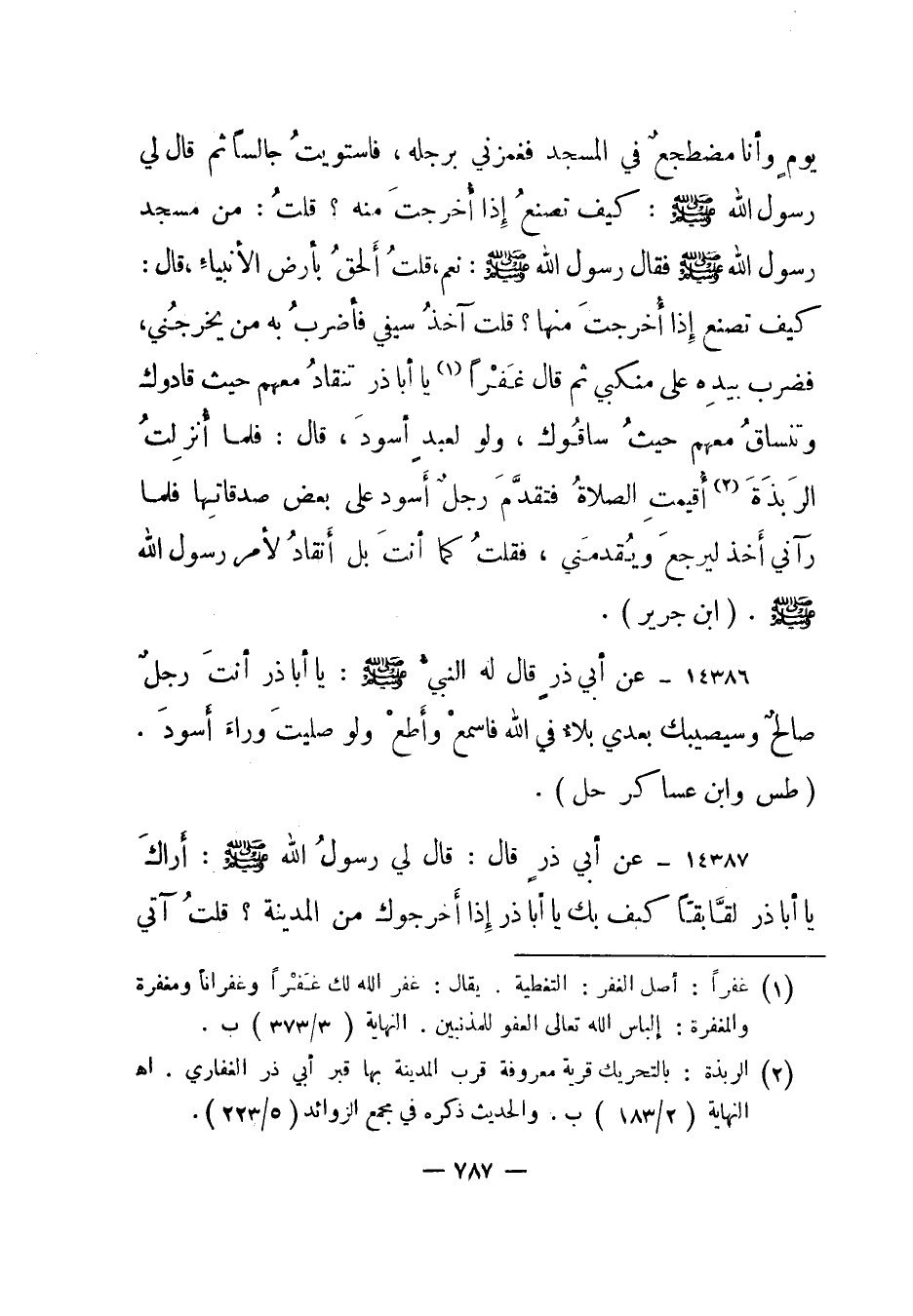 14387- عن أبي ذر قال: قال لي رسول الله صلى الله عليه وسلم: أراك يا أبا ذر لقابقا كيف بك يا أبا ذر إذا أخرجوك من المدينة؟ قلت: آتي