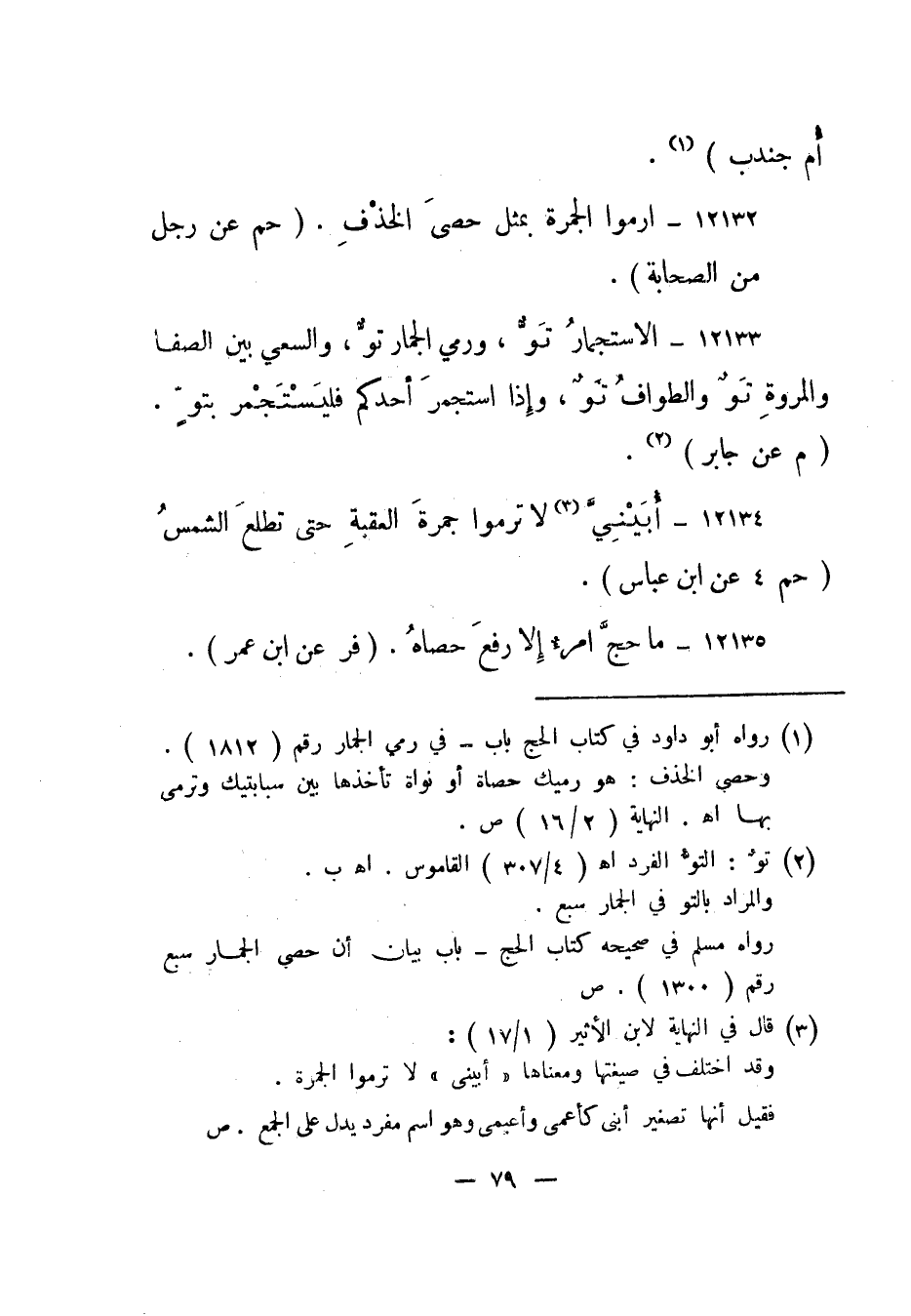 3 قال في النهاية لابن الأثير "1/17": وقد اختلف في صيغتها ومعناها " أبينى" لا ترموا الجمرة. فقيل أنها تصغير أبنى كأعمى وأعيمى وهو اسم مفرد يدل على الجمع. ص.
