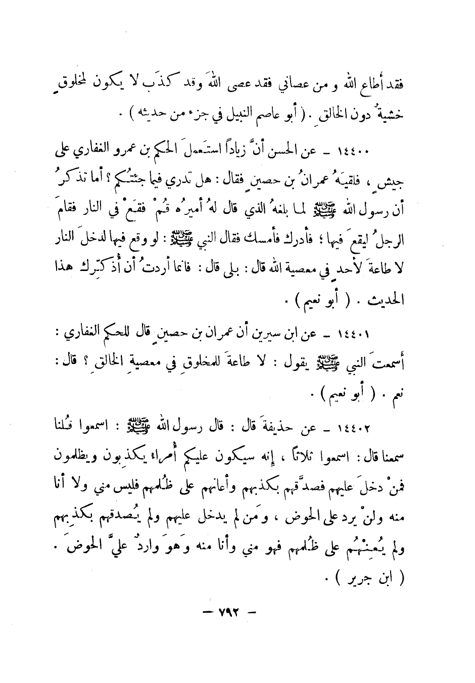 14401- عن ابن سيرين أن عمران بن حصين قال للحكم الغفاري: أسمعت النبي صلى الله عليه وسلم يقول: لا طاعة للمخلوق في معصية الخالق؟ قال: نعم. "أبو نعيم".