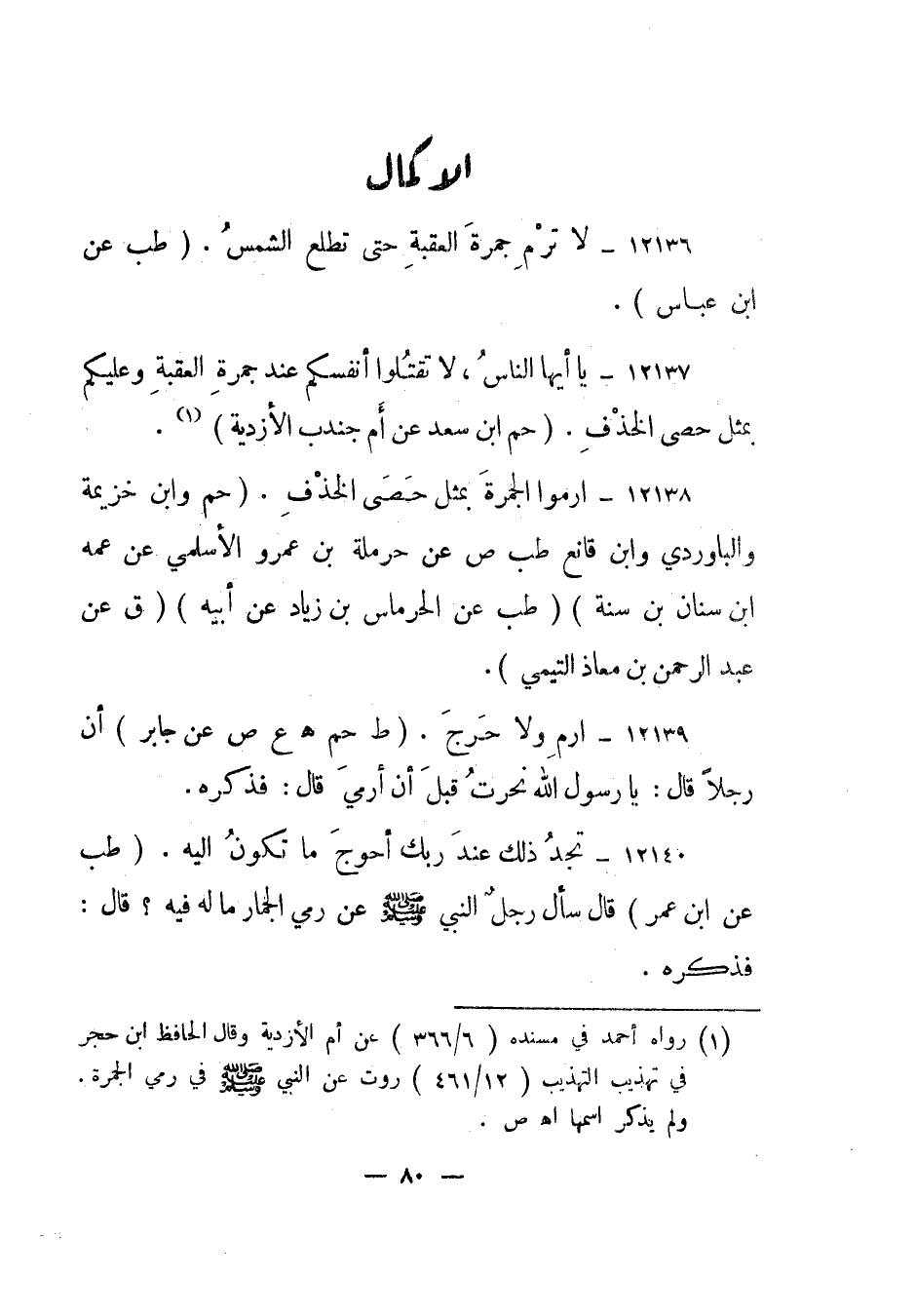 12137 يا أيها الناس، لا تقتلوا أنفسكم عند جمرة العقبة وعليكم بمثل حصى الخذف. "حم ابن سعد عن أم جندب الأزدية"1