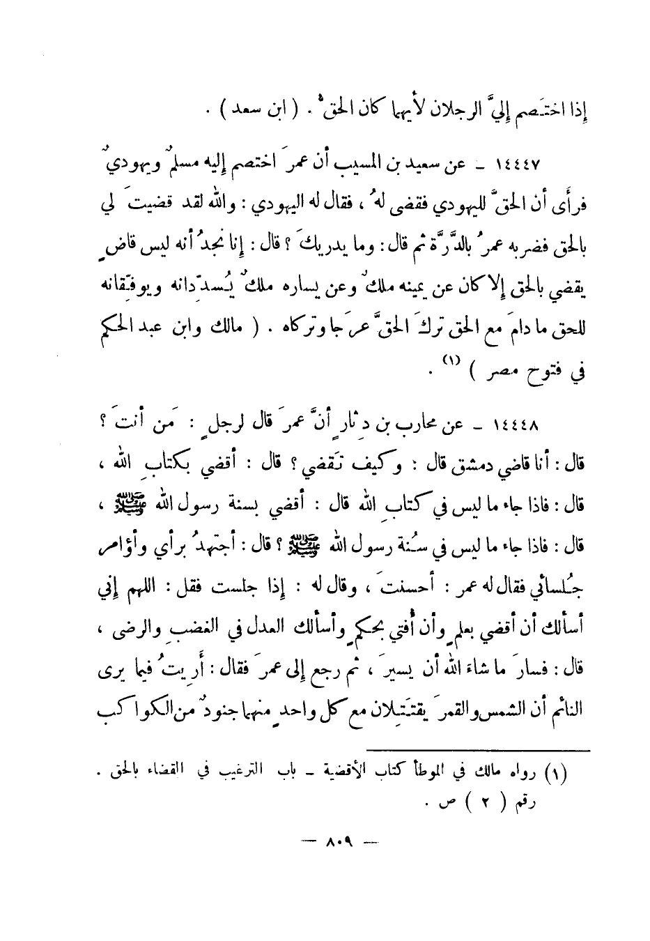 1 رواه مالك في الموطأ كتاب الأقضية - باب الترغيب في القضاء بالحق. رقم "2" ص.