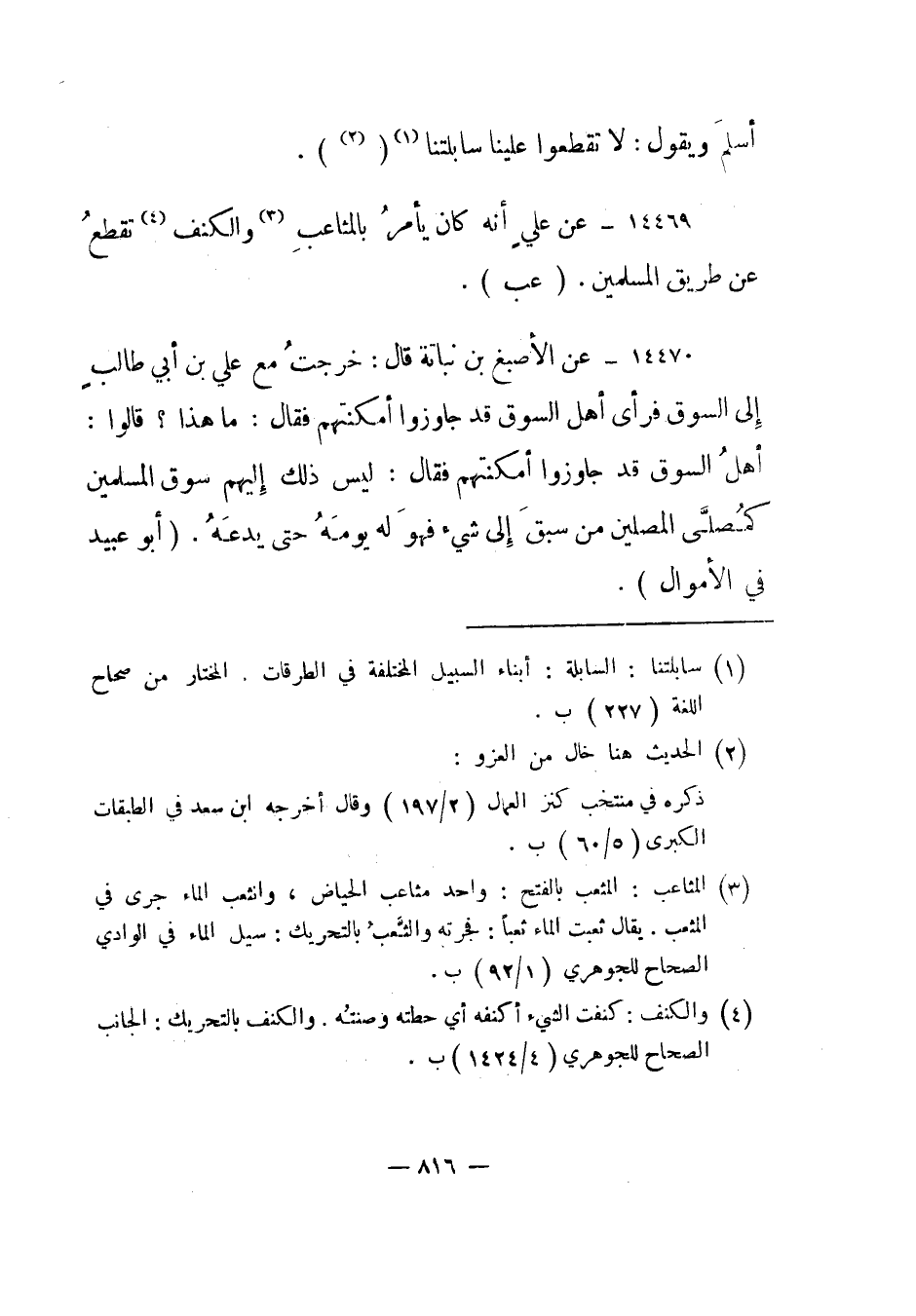 14469- عن علي أنه كان يأمر بالمثاعب3 والكنف4 تقطع عن طريق المسلمين. "عب".