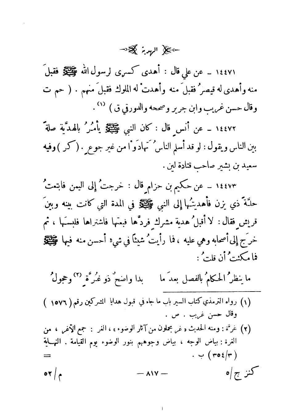1 رواه الترمذي كتاب السير باب ما جاء في قبول هدايا المشركين رقم "1576" وقال حسن غريب. ص.