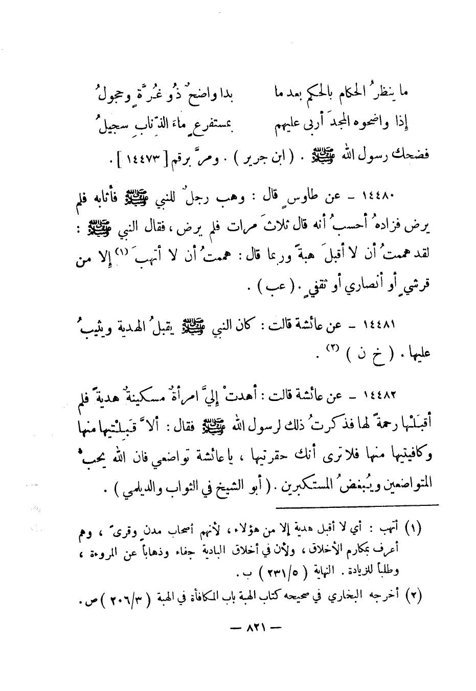 14481- عن عائشة قالت: كان النبي صلى الله عليه وسلم يقبل الهدية ويثيب عليها. "خ ن"2