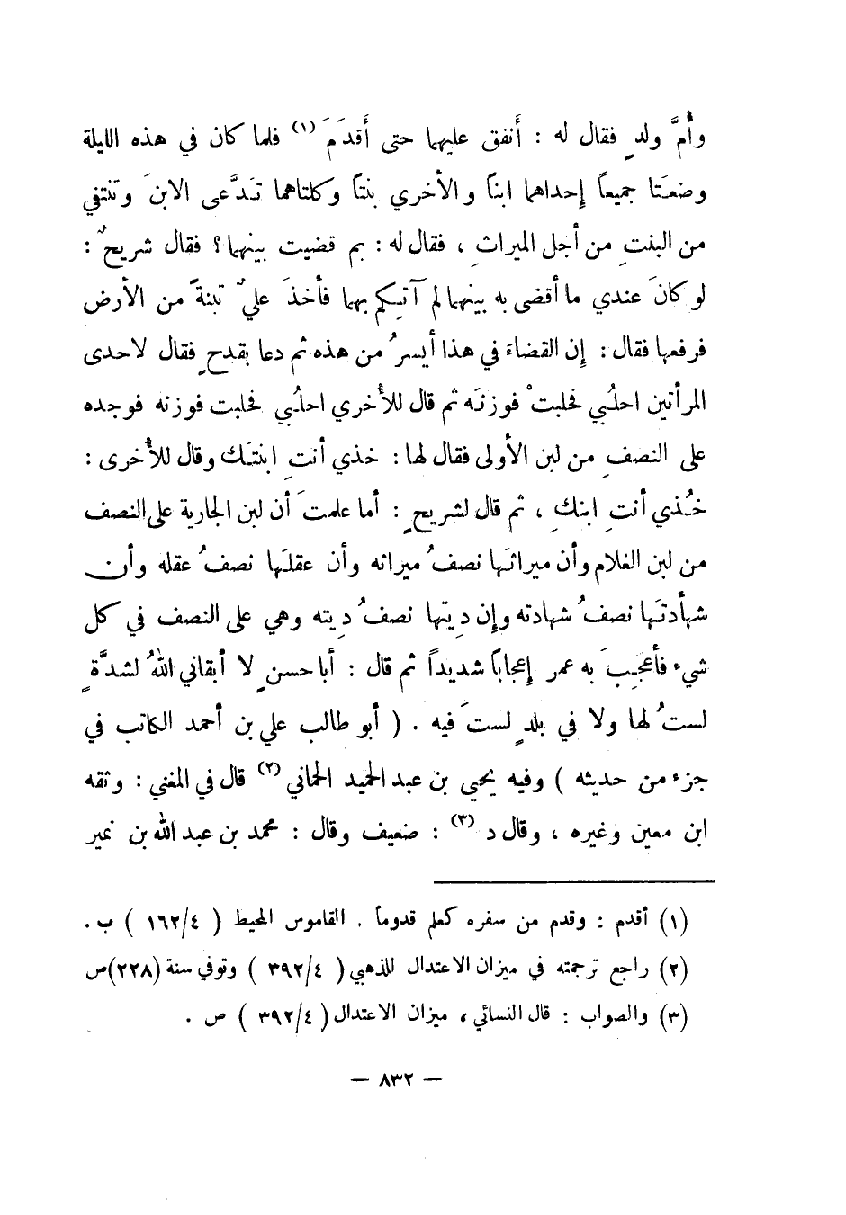 وأم ولد فقال له: أنفق عليهما حتى أقدم1 فلما كان في هذه الليلة وضعتا جميعا إحداهما ابنا والأخرى بنتا وكلتاهما تدعى الابن وتنتفي من البنت من أجل الميراث، فقال له: بم قضيت بينهما؟ فقال شريح: لو كان عندي ما أقضى به بينهما لم آتكم بهما فأخذ علي تبنة من الأرض فرفعها فقال: إن القضاء في هذا أيسر من هذه ثم دعا بقدح فقال لإحدى المرأتين احلبي فحلبت فوزنه ثم قال للأخرى احلبي فحلبت فوزنه فوجده على النصف من لبن الأولى فقال لها: خذي أنت ابنتك وقال للأخرى: خذي أنت ابنك، ثم قال لشريح: أما علمت أن لبن الجارية على النصف من لبن الغلام وأن ميراثها نصف ميراثه وأن عقلها نصف عقله وأن شهادتها نصف شهادته وإن ديتها نصف ديته وهي على النصف في كل شيء فأعجب به عمر إعجابا شديدا ثم قال: أبا حسن لا أبقاني الله لشدة لست لها ولا في بلد لست فيه. "أبو طالب علي بن أحمد الكاتب في جزء من حديثه" وفيه يحيى بن عبد الحميد الحماني2 قال في المغني: وثقه ابن معين وغيره، وقال د3: ضعيف وقال: محمد بن عبد الله بن نمير