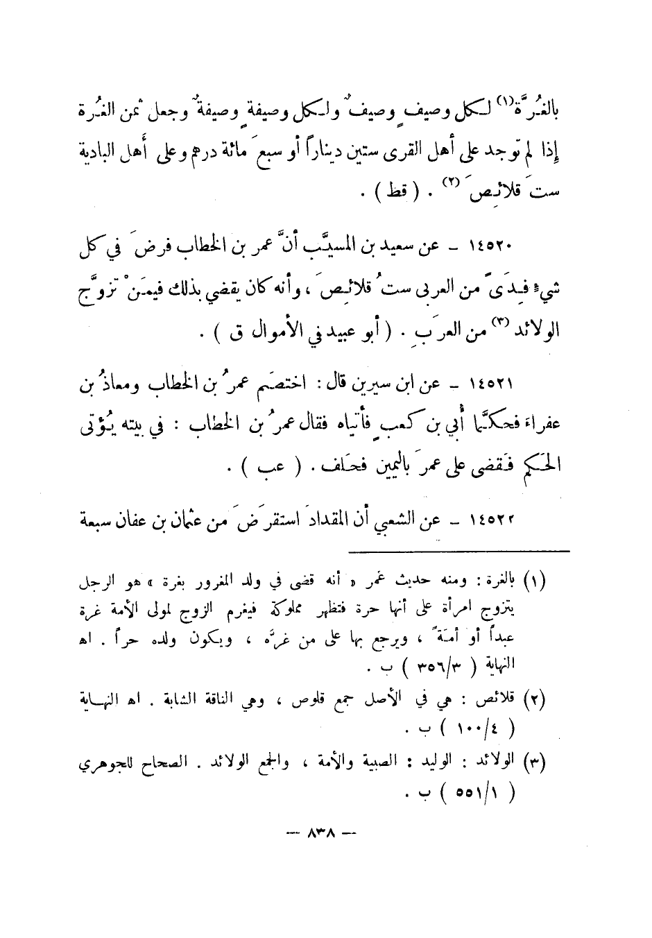 14520- عن سعيد بن المسيب أن عمر بن الخطاب فرض في كل شيء فدى من العربي ست قلائص، وأنه كان يقضي بذلك فيمن تزوج الولائد3 من العرب. "أبو عبيد في الأموال ق".