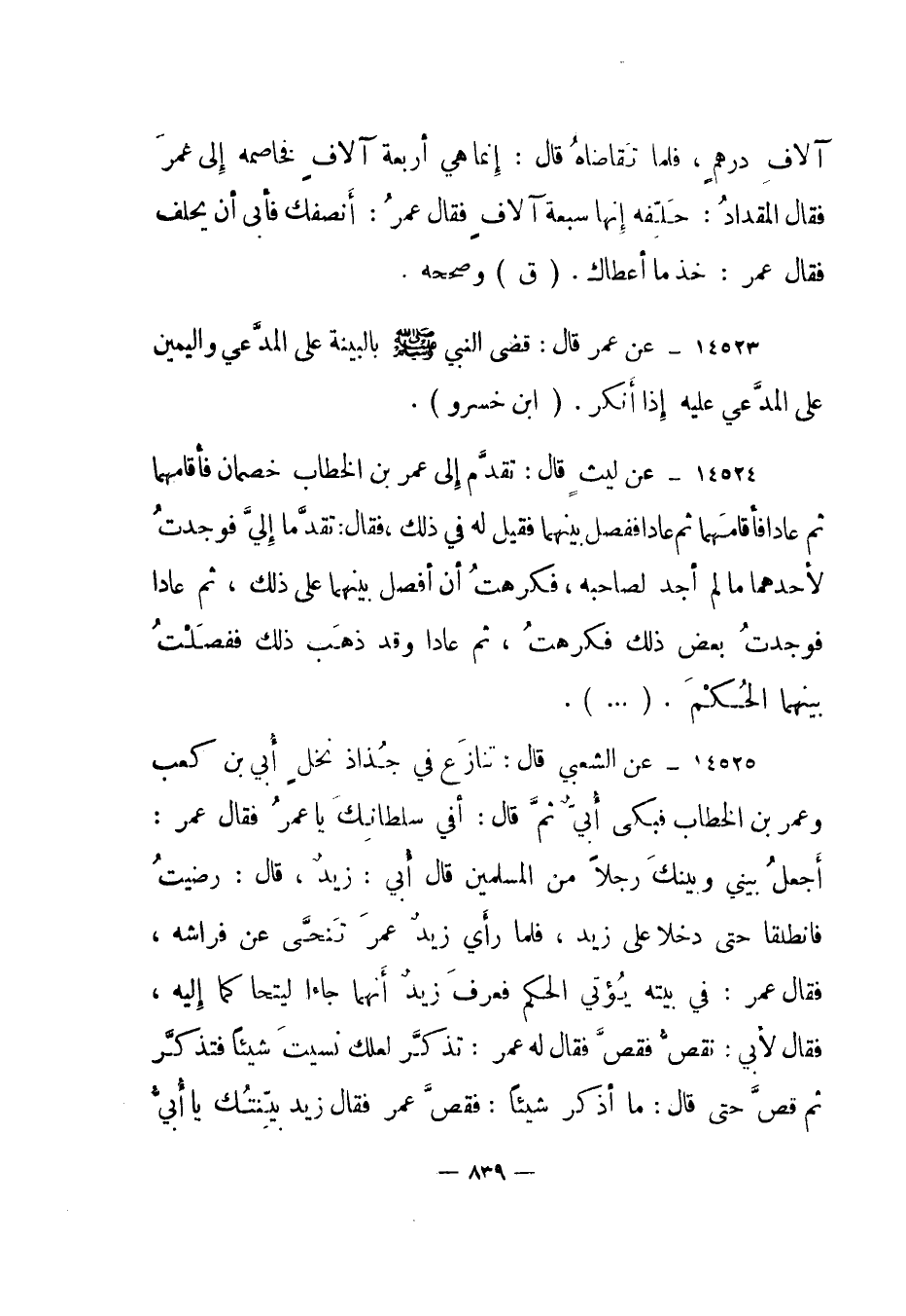 14525- عن الشعبي قال: تنازع في جذاذ نخل أبي بن كعب وعمر بن الخطاب فبكى أبي ثم قال: أفي سلطانك يا عمر فقال عمر: أجعل بيني وبينك رجلا من المسلمين قال أبي: زيد، قال: رضيت فانطلقا حتى دخلا على زيد، فلما رأي زيد عمر تنحى عن فراشه، فقال عمر: في بيته يؤتي الحكم فعرف زيد أنهما جاءا ليتحاكما إليه، فقال لأبي: نقص فقص فقال له عمر: تذكر لعلك نسيت شيئا فتذكر ثم قص حتى قال: ما أذكر شيئا: فقص عمر فقال زيد بينتك يا أبي