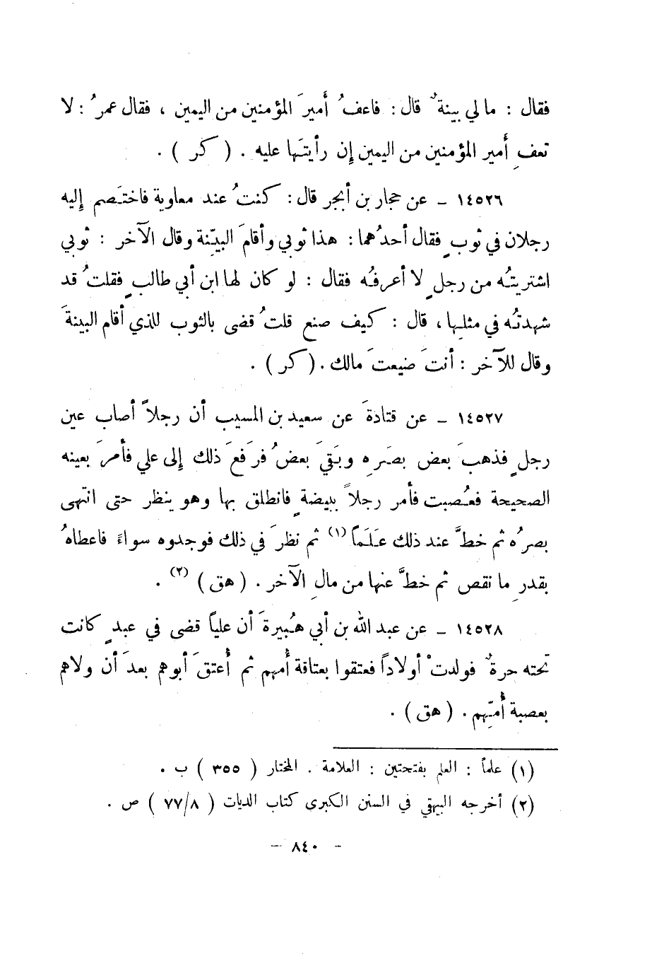 14527- عن قتادة عن سعيد بن المسيب أن رجلا أصاب عين رجل فذهب بعض بصره وبقي بعض فرفع ذلك إلى علي فأمر بعينه الصحيحة فعصبت فأمر رجلا ببيضة فانطلق بها وهو ينظر حتى انتهى بصره ثم خط عند ذلك علما1 ثم نظر في ذلك فوجدوه سواء فأعطاه بقدر ما نقص ثم خط عنها من مال الآخر. "هق"2