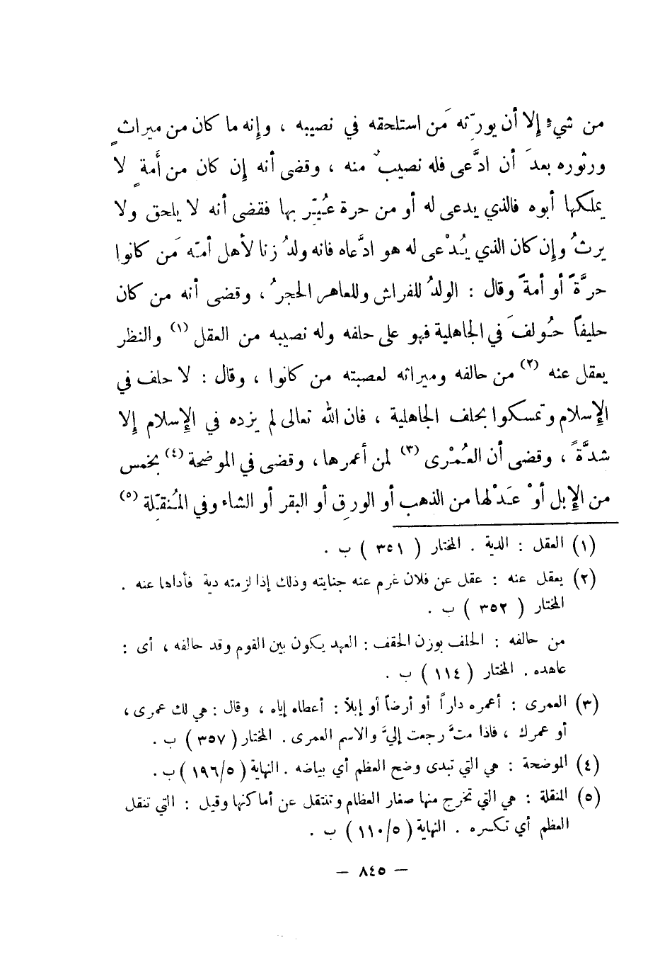 شيء إلا أن يورثه من استلحقه في نصيبه، وإنه ما كان من ميراث ورثوه بعد أن ادعى فله نصيب منه، وقضى أنه إن كان من أمة لا يملكها أبوه فالذي يدعى له أو من حرة عير بها فقضى أنه لا يلحق ولا يرث وإن كان الذي يدعى له هو ادعاه فإنه ولد زنا لأهل أمه من كانوا حرة أو أمة وقال: الولد للفراش وللعاهر الحجر، وقضى أنه من كان حليفا حولف في الجاهلية فهو على حلفه وله نصيبه من العقل1 والنظر يعقل عنه2 من حالفه وميراثه لعصبته من كانوا، وقال: لا حلف في الإسلام وتمسكوا بحلف الجاهلية، فإن الله تعالى لم يزده في الإسلام إلا شدة، وقضى أن العمرى3 لمن أعمرها، وقضى في الموضحة4 بخمس من الإبل أو عدلها من الذهب أو الورق أو البقر أو الشاء وفي المنقلة.5