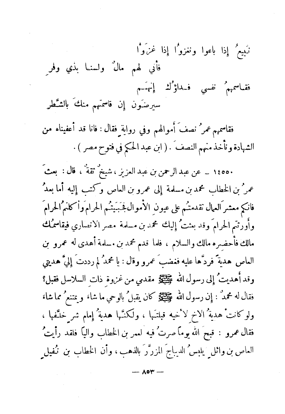 14550- عن عبد الرحمن بن عبد العزيز، شيخ ثقة، قال: بعث عمر بن الخطاب محمد بن مسلمة إلى عمرو بن العاص وكتب إليه أما بعد فإنكم معشر العمال تقدمتم على عيون الأموال فجبيتم الحرام وأكلتم الحرام وأورثتم الحرام وقد بعثت إليك محمد بن مسلمة مصر الأنصاري فيقاسمك مالك فأحضره مالك والسلام، فلما قدم محمد بن مسلمة أهدى له عمرو بن العاص هدية فردها عليه فغضب عمرو وقال: يا محمد لم رددت إلي هديتي وقد أهديت إلى رسول الله صلى الله عليه وسلم مقدمي من غزوة ذات السلاسل فقبل؟ فقال له محمد: إن رسول الله صلى الله عليه وسلم كان يقبل بالوحي ما شاء ويمتنع مما شاء ولو كانت هدية الأخ لأخيه قبلتها، ولكنها هدية إمام شر خلفها، فقال عمرو: قبح الله يوما صرت فيه لعمر بن الخطاب واليا فلقد رأيت العاص بن وائل يلبس الديباج المزرر بالذهب، وأن الخطاب بن نفيل