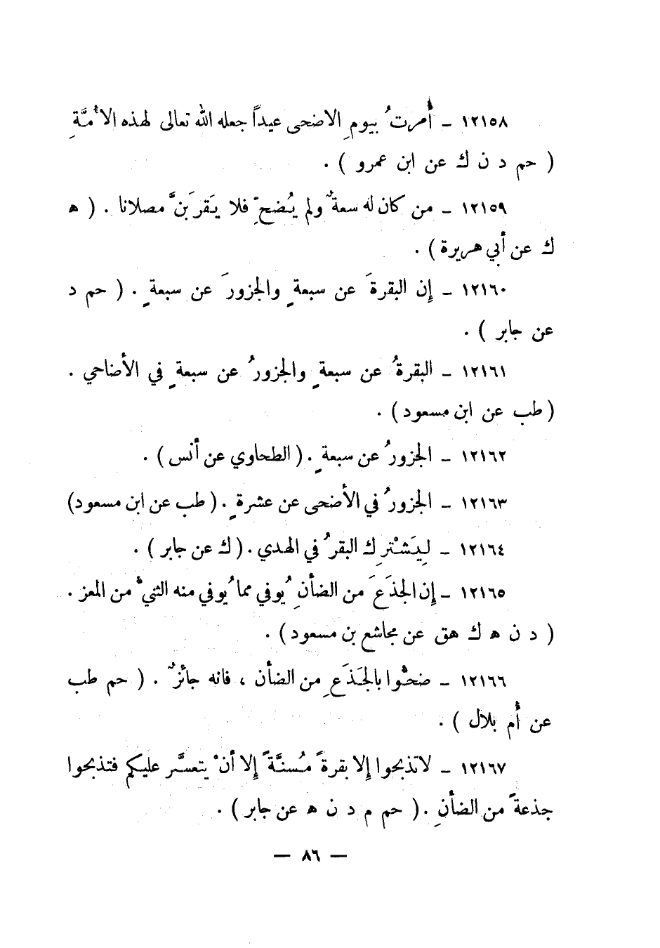12161- البقرة عن سبعة والجزور عن سبعة في الأضاحي. "طب عن ابن مسعود".
