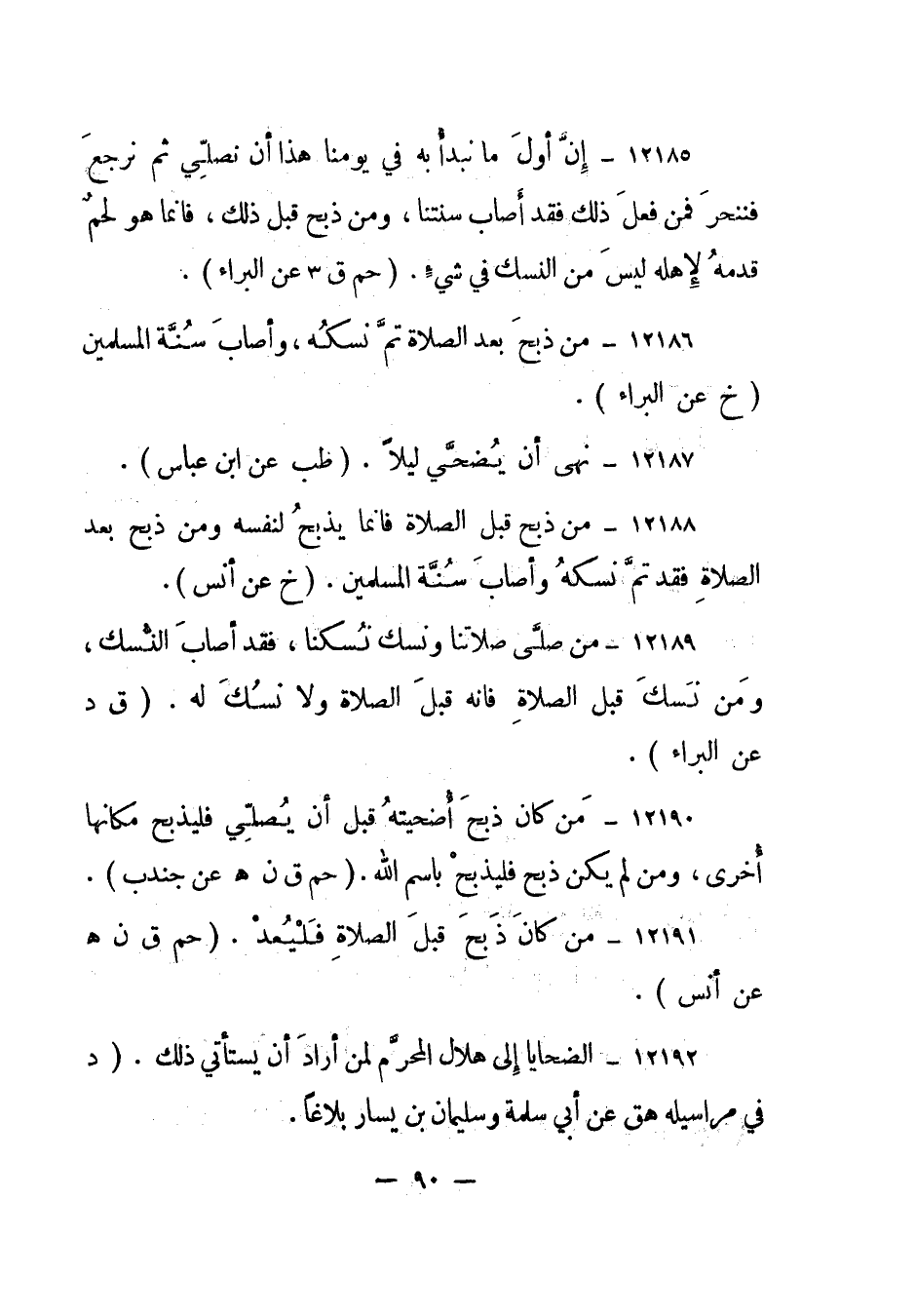 12186- من ذبح بعد الصلاة تم نسكه، وأصاب سنة المسلمين. "خ عن البراء".