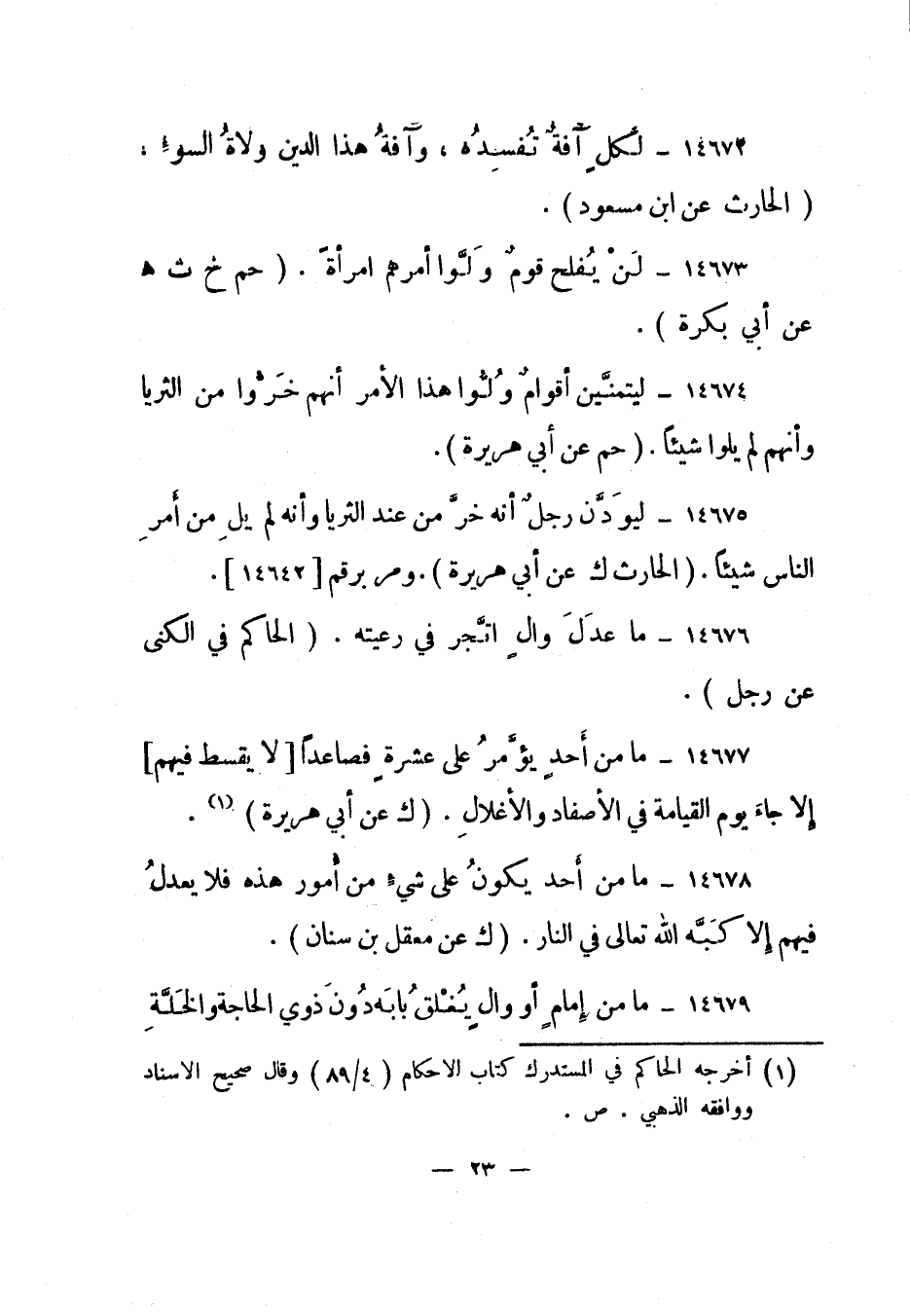 14673- "لن يفلح قوم ولوا أمرهم امرأة". "حم خ ت هـ عن أبي بكرة".