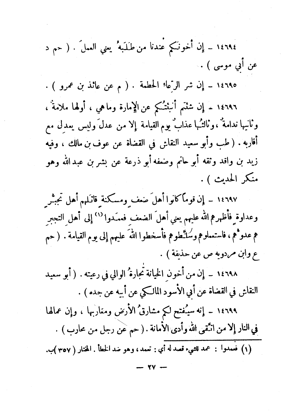 14698- "إن من أخون الخيانة تجارة الوالي في رعيته". "أبو سعيد النقاش في القضاة عن أبي الأسود المالكي عن أبيه عن جده".