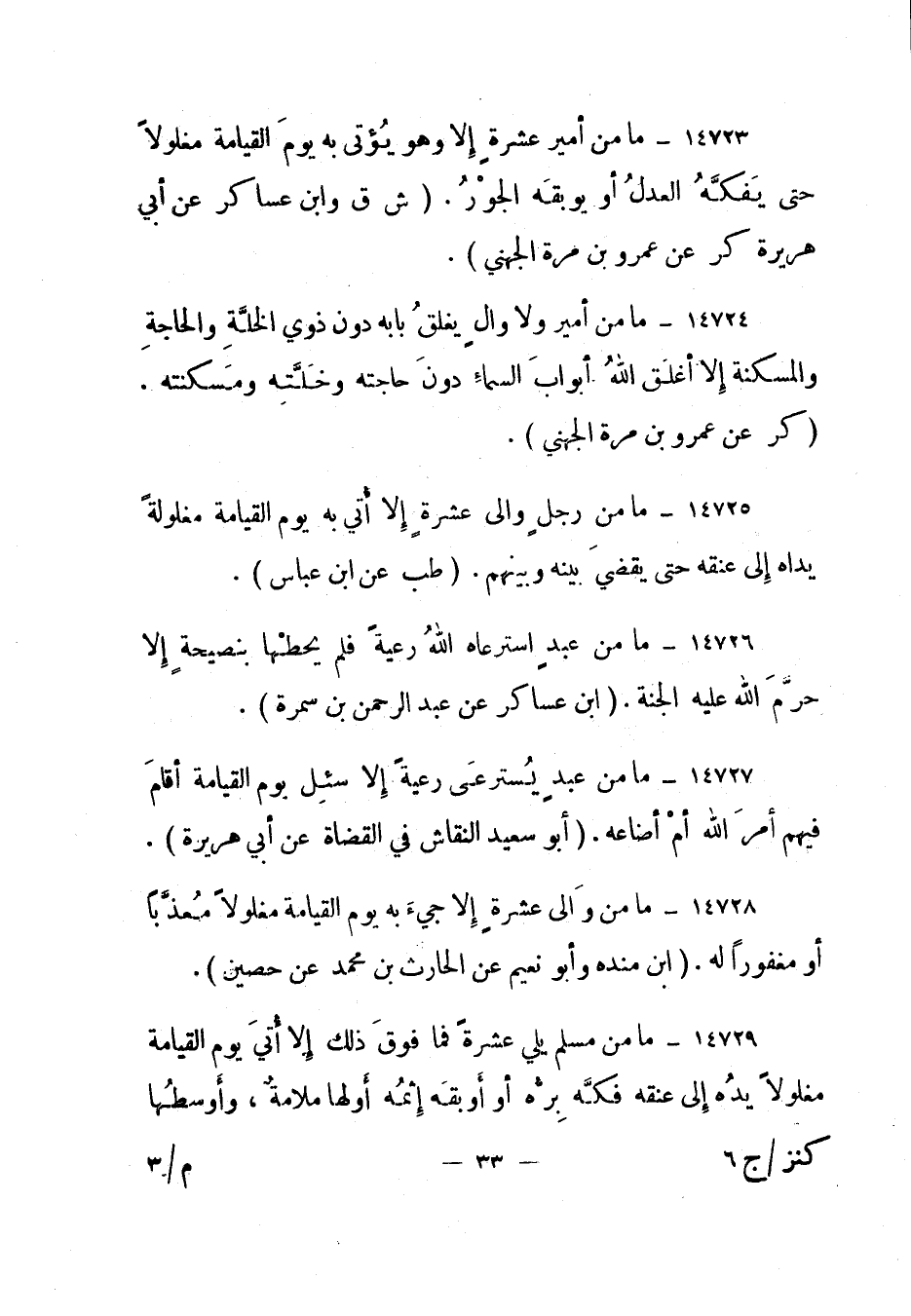 14728- "ما من والى عشرة إلا جيء به يوم القيامة مغلولا معذبا أو مغفورا له". "ابن منده وأبو نعيم عن الحارث بن محمد عن حصين".