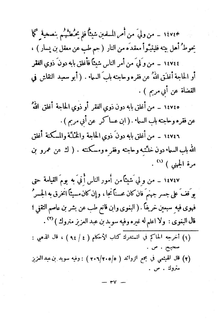 14744- "من ولي من أمر الناس شيئا فأغلق بابه دون ذوي الفقر أو الحاجة أغلق الله عن فقره وحاجته باب السماء". "أبو سعيد النقاش في القضاة عن أبي مريم".