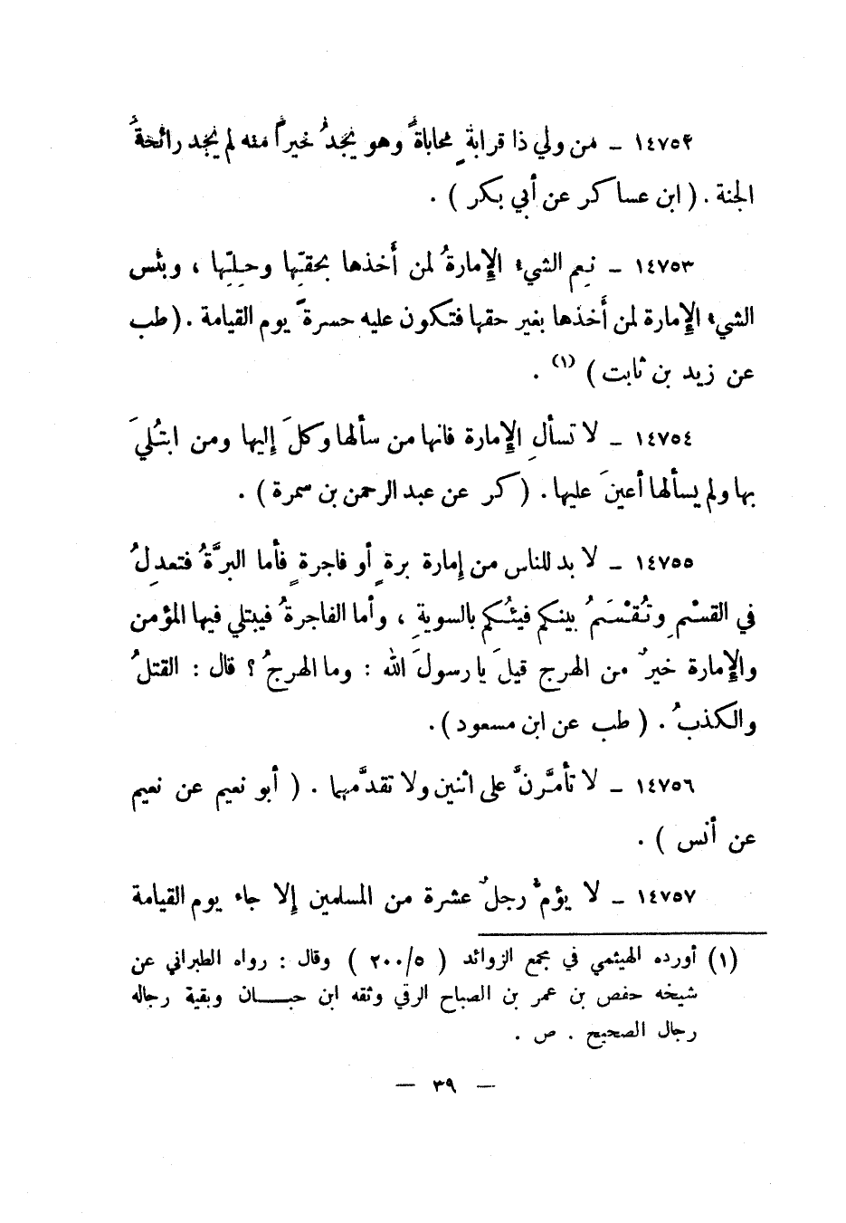 14753- "نعم الشيء الإمارة لمن أخذها بحقها وحلها، وبئس الشيء الإمارة لمن أخذها بغير حقها فتكون عليه حسرة يوم القيامة". "طب عن زيد بن ثابت" 1