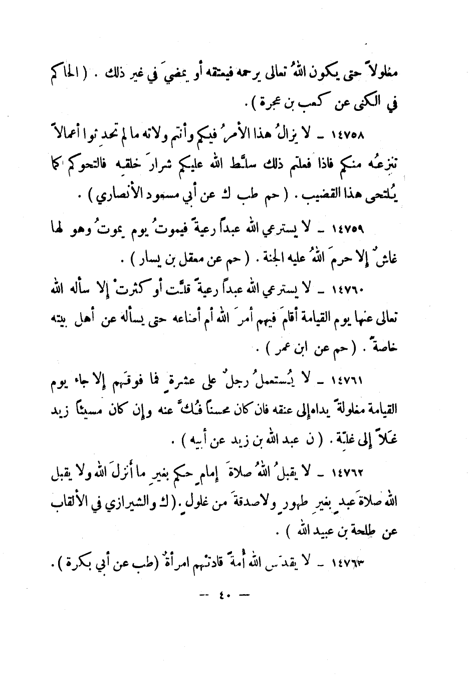 14764- "لا يكون رجل على قوم إلا جاء يقدمهم يوم القيامة على يديه راية يحملها وهم يتبعونه فيسأل عنهم ويسألون عنه". "طب عن المقدام بن معد يكرب".