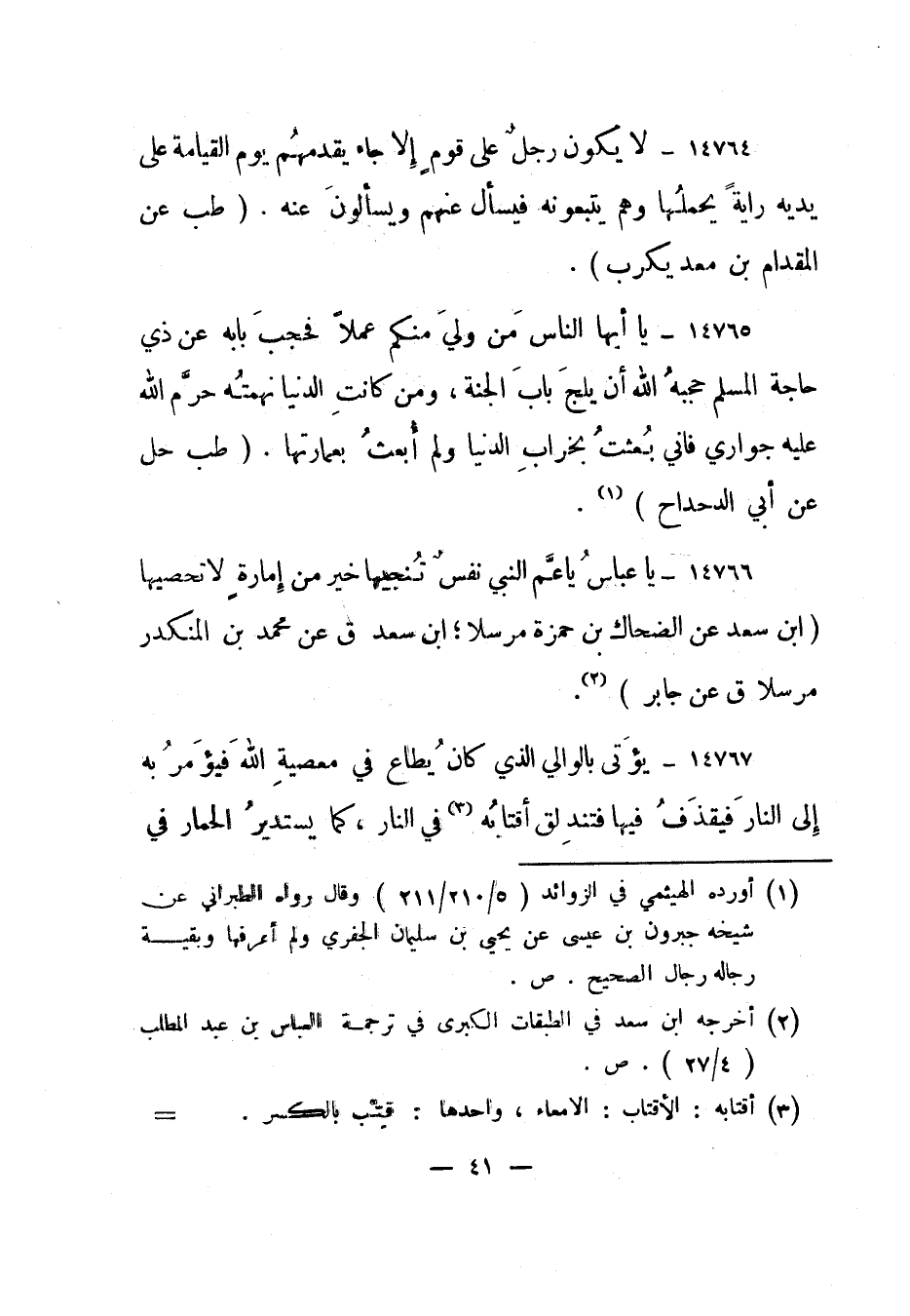 14764- "لا يكون رجل على قوم إلا جاء يقدمهم يوم القيامة على يديه راية يحملها وهم يتبعونه فيسأل عنهم ويسألون عنه". "طب عن المقدام بن معد يكرب".