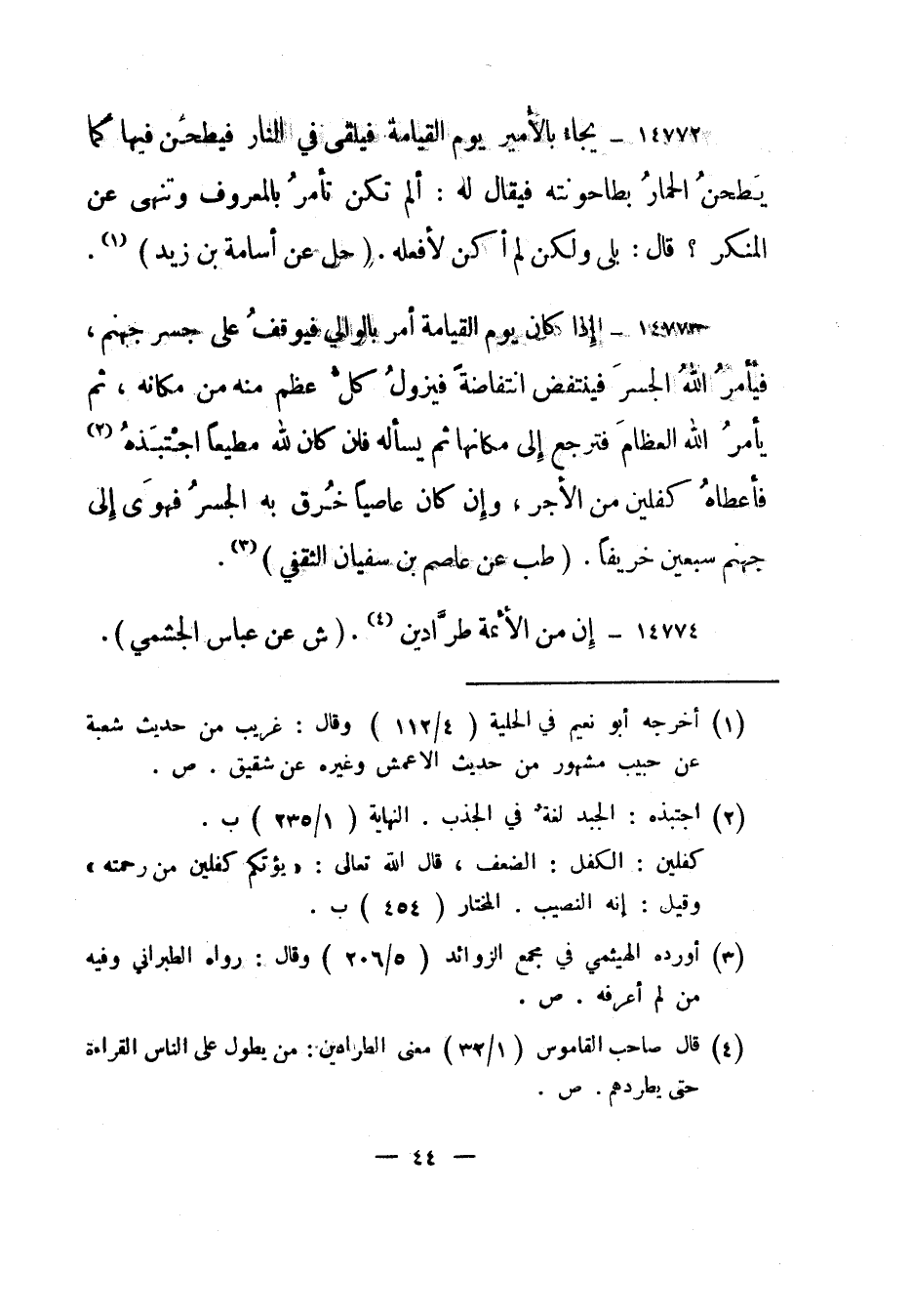 14772- "يجاء بالأمير يوم القيامة فيلقى في النار فيطحن فيها كما يطحن الحمار بطاحونته فيقال له: ألم تكن تأمر بالمعروف وتنهى عن المنكر؟ قال: بلى ولكن لم أكن لأفعله". "حل عن أسامة بن زيد". 1.