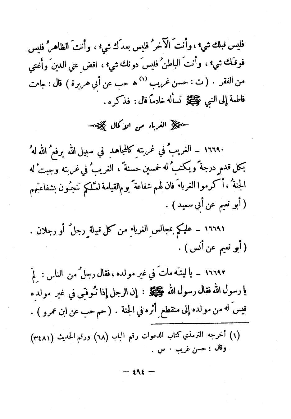 16690- " الغريب في غربته كالمجاهد في سبيل الله يرفع الله له بكل قدم درجة ويكتب له خمسين حسنة، الغريب في غربته وجبت له الجنة، أكرموا الغرباء فإن لهم شفاعة يوم القيامة لعلكم تنجون بشفاعتهم". "أبو نعيم عن أبي سعيد".