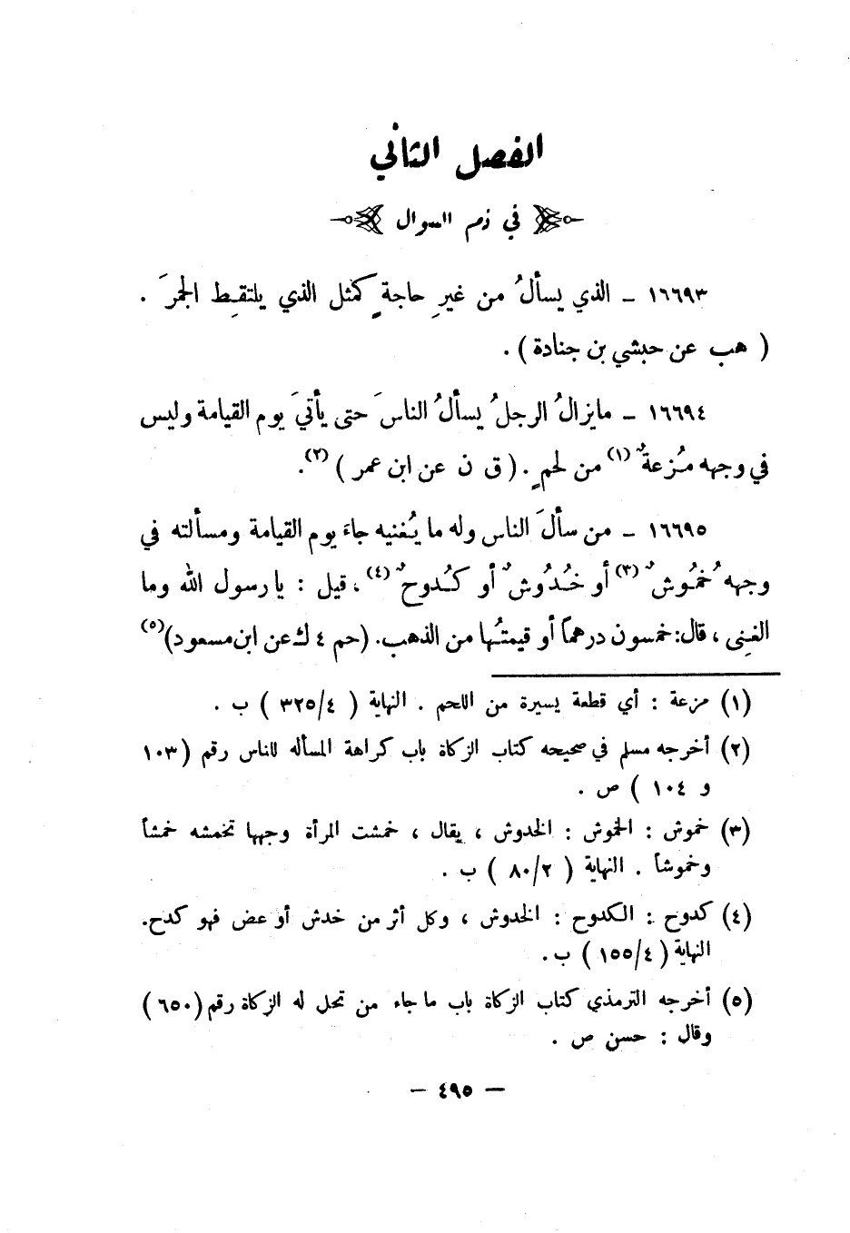 16694- "ما يزال الرجل يسأل الناس حتى يأتي يوم القيامة وليس في وجهه مزعة 1 من لحم". "ق ن عن ابن عمر" 2.