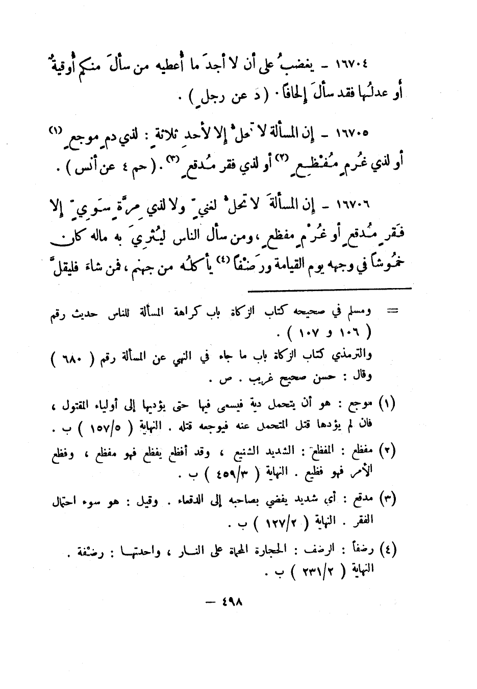 16705- "إن المسألة لا تحل إلا لأحد ثلاثة: لذي دم موجع 1 أو لذي غرم مفظع 2 أو لذي فقر مدقع 3". "حم 4 عن أنس".