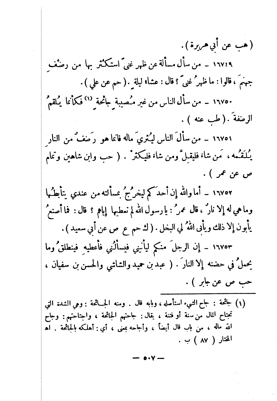 16750- "من سأل الناس من غير مصيبة جائحة 1 فكأنما يلقم الرضفة". "طب عنه".