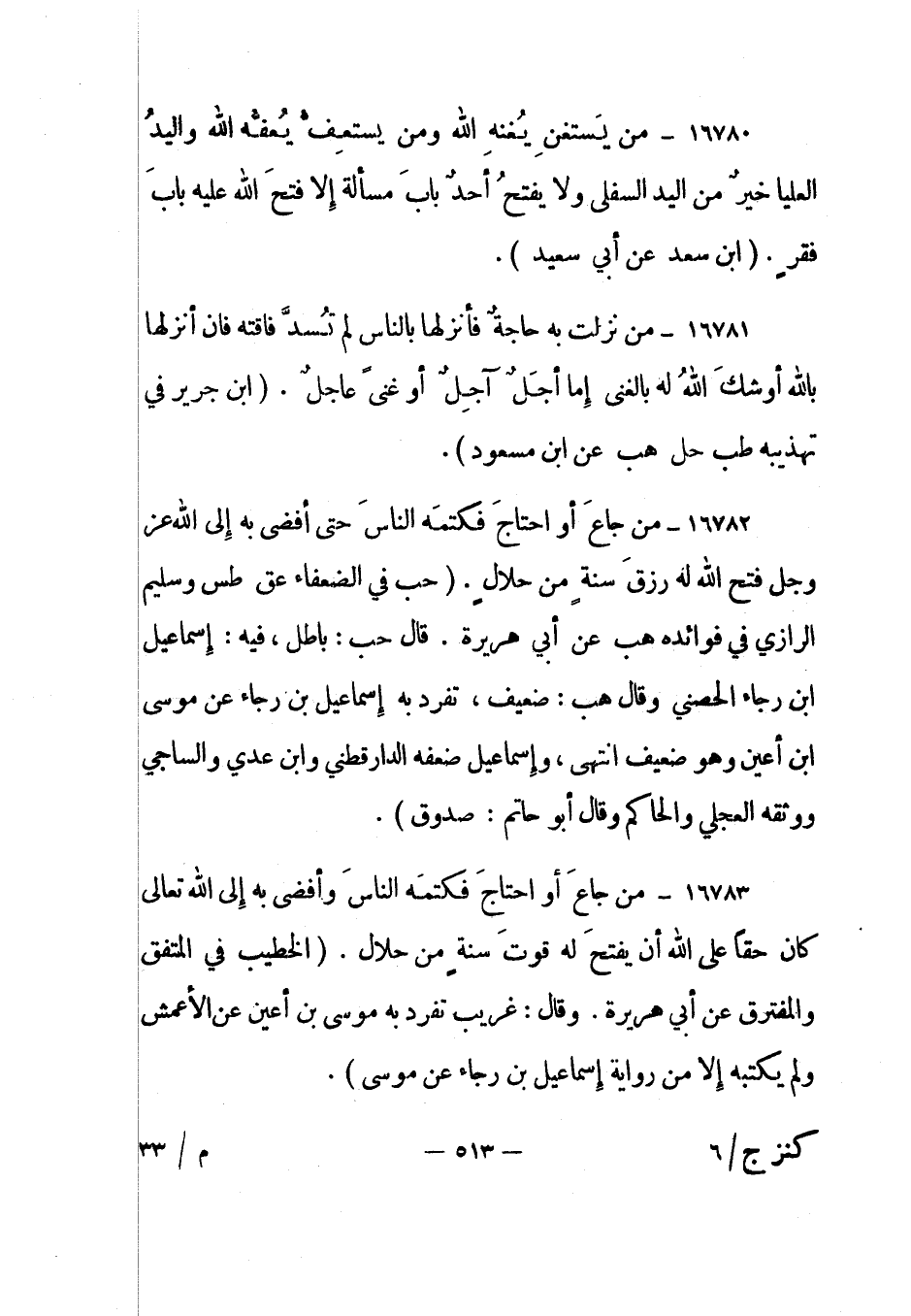16783- "من جاع أو احتاج فكتمه الناس وأفضى به إلى الله تعالى كان حقا على الله أن يفتح له قوت سنة من حلال". "الخطيب في المتفق والمفترق عن أبي هريرة، وقال: غريب تفرد به موسى بن أعين عن الأعمش ولم يكتبه إلا من رواية إسماعيل بن رجاء عن موسى".