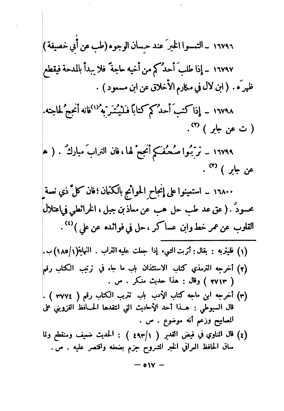 16799- "تربوا صحفكم أنجح لها، فإن التراب مبارك". "هـ عن جابر" 3.
