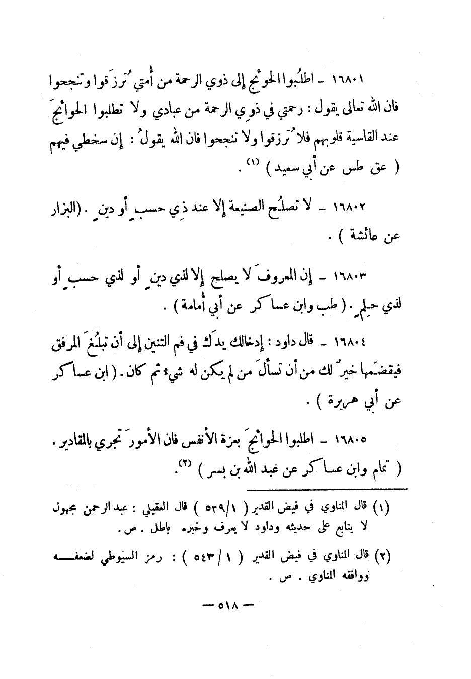 16805- "اطلبوا الحوائج بعزة الأنفس فإن الأمور تجري بالمقادير". "تمام وابن عساكر عن عبد الله بن بسر" 2.