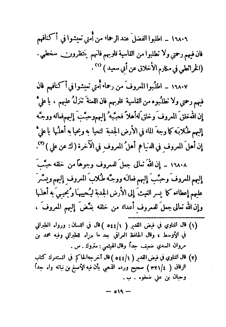 16807- "اطلبوا المعروف من رحماء أمتي تعيشوا في أكنافهم فإن فيهم رحمتي ولا تطلبوه من القاسية قلوبهم فإن اللعنة تنزل عليهم، يا علي إن الله خلق المعروف وخلق له أهلا فحببه إليهم وحبب إليهم فعاله ووجه إليهم طلابه كما وجه الماء في الأرض الجدبة لتحيا به ويحيا به أهلها يا علي إن أهل المعروف في الدنيا هم أهل المعروف في الآخرة". "ك عن علي" 2.