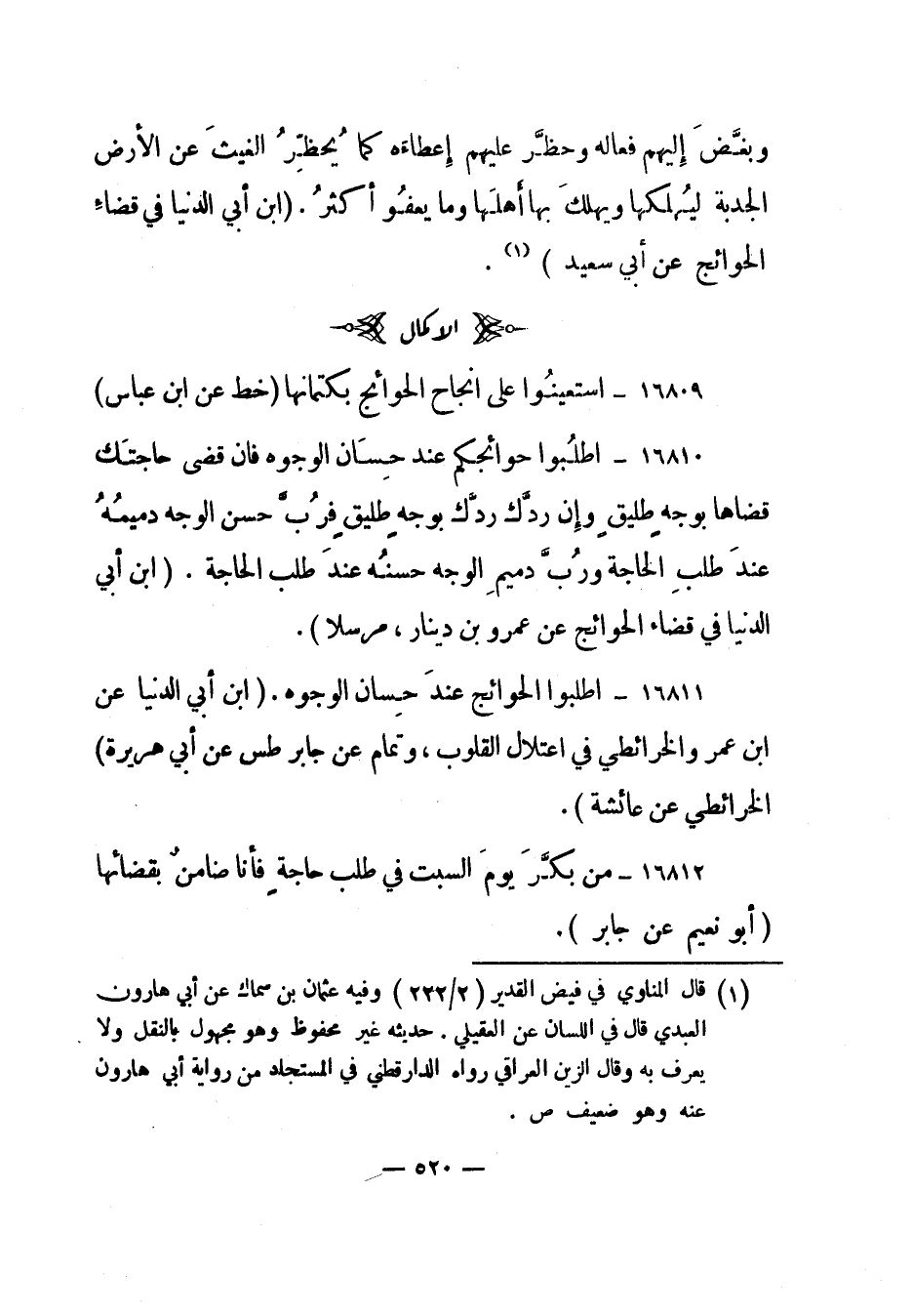 16811- "اطلبوا الحوائج عند حسان الوجوه". "ابن أبي الدنيا عن ابن عمر والخرائطي في إعتلال القلوب، وتمام عن جابر طس عن أبي هريرة، الخرائطي عن عائشة".