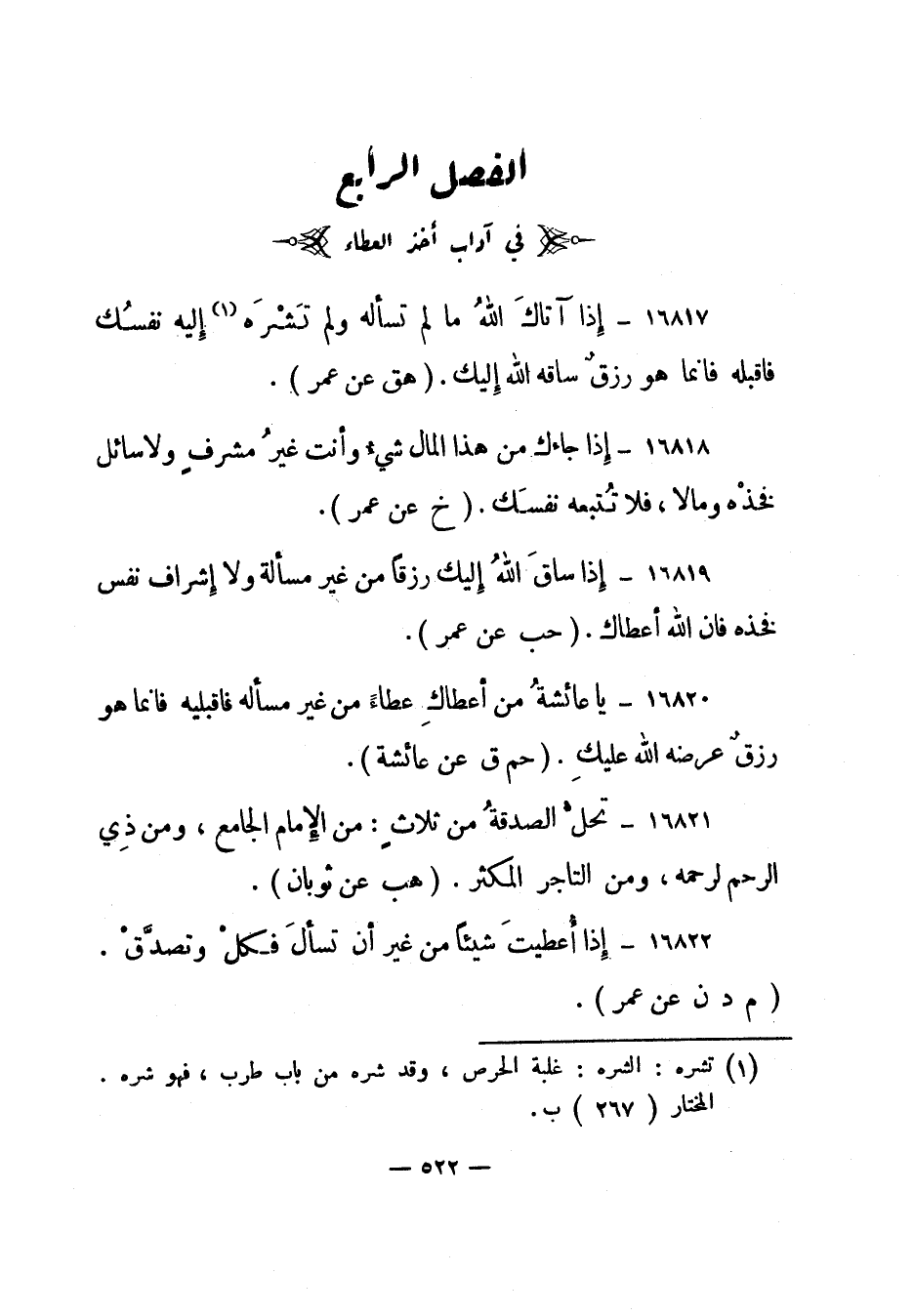 16818- "إذا جاءك من هذا المال شيء وأنت غير مشرف ولا سائل فخذه ومالا، فلا تتبعه نفسك". "خ عن عمر".