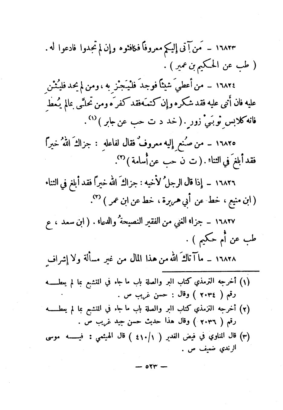 16825- "من صنع إليه معروف فقال لفاعله: جزاك الله خيرا فقد ابلغ في الثناء". "ت ن حب عن أسامة" 2.