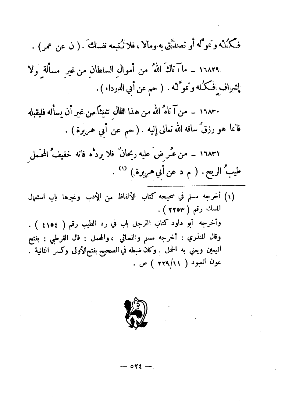 16831- "من عرض عليه ريحان فلا يرده فإنه خفيف المحمل طيب الريح". "م د عن أبي هريرة" 3.