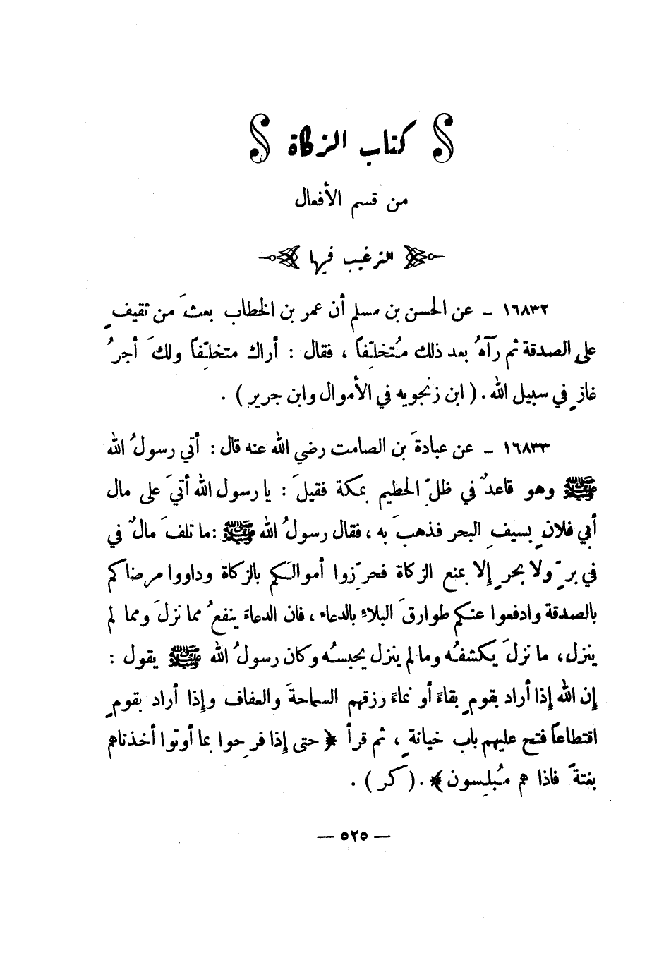 16833- "عن عبادة بن الصامت رضي الله عنه قال: أتي رسول الله صلى الله عليه وسلم وهو قاعد في ظل الحطيم بمكة فقيل: يا رسول الله أتي على مال أبي فلان بسيف البحر فذهب به، فقال رسول الله صلى الله عليه وسلم: ما تلف مال في بر ولا بحر إلا بمنع الزكاة فحرزوا أموالكم بالزكاة وداووا مرضاكم بالصدقة وادفعوا عنكم طوارق البلاء بالدعاء، فإن الدعاء ينفع مما نزل ومما لم ينزل، ما نزل يكشفه وما لم ينزل يحبسه وكان رسول الله صلى الله عليه وسلم يقول: إن الله إذا أراد بقوم بقاء أو نماء رزقهم السماحة والعفاف وإذا أراد بقوم اقتطاعا فتح عليهم باب خيانة، ثم قرأ {حَتَّى إِذَا فَرِحُوا بِمَا أُوتُوا أَخَذْنَاهُمْ بَغْتَةً فَإِذَا هُمْ مُبْلِسُونَ} . "كر".