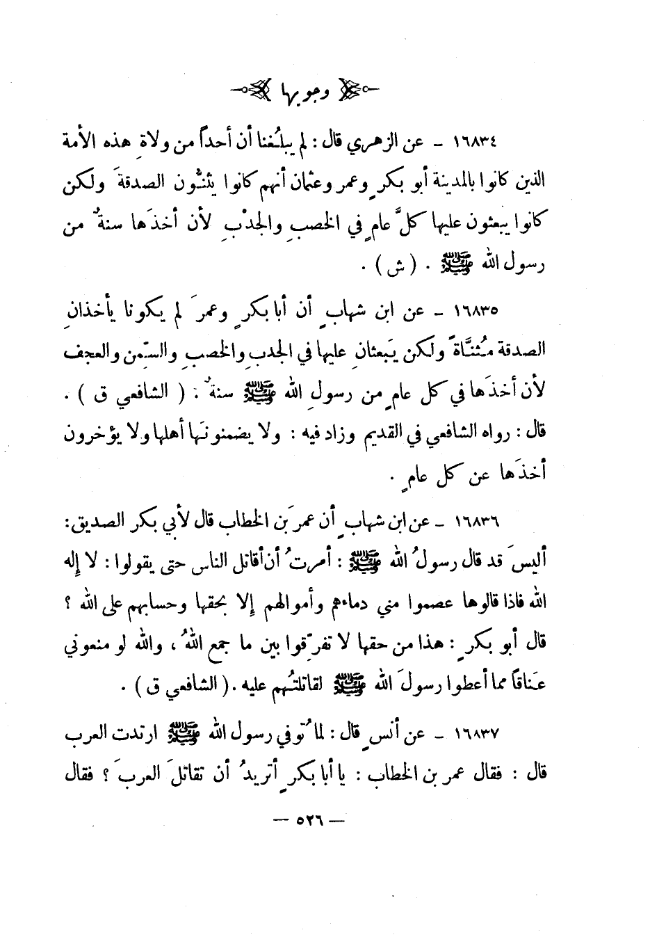 16836- عن ابن شهاب أن عمر بن الخطاب قال لأبي بكر الصديق: "أليس قد قال رسول الله صلى الله عليه وسلم: أمرت أن أقاتل الناس حتى يقولوا: لا إله إلا الله فإذا قالوها عصموا مني دماءهم وأموالهم إلا بحقها وحسابهم على الله؟ قال أبو بكر: هذا من حقها لا تفرقوا بين ما جمع الله، والله لو منعوني عناقا مما أعطوا رسول الله صلى الله عليه وسلم لقاتلتهم عليه". "الشافعي ق".
