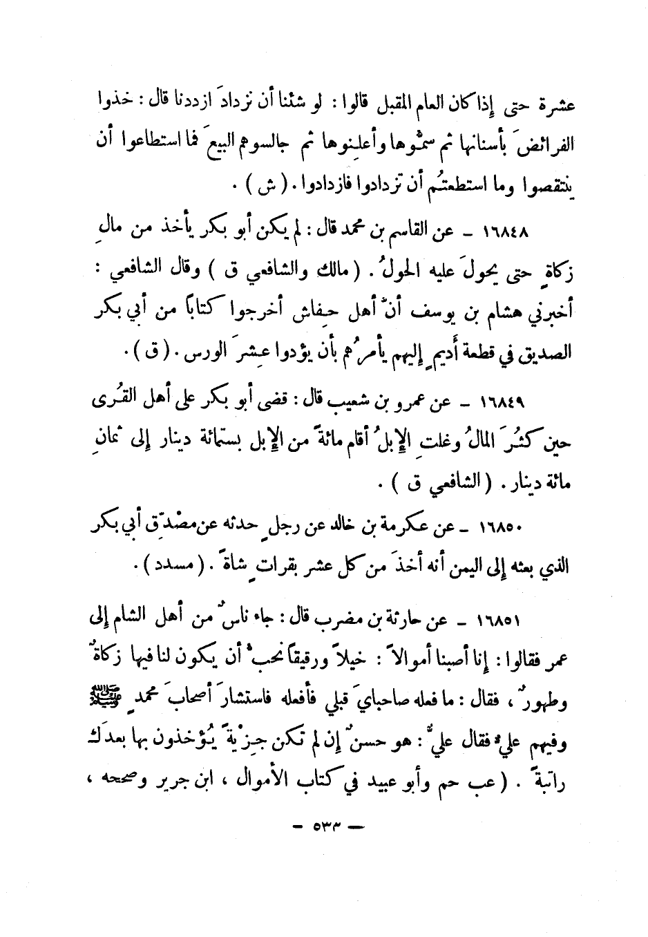 16851- عن حارثة بن مضرب قال: "جاء ناس من أهل الشام إلى عمر فقالوا: إنا أصبنا أموالا: خيلا ورقيقا نحب أن يكون لنا فيها زكاة وطهور، فقال: ما فعله صاحباي قبلي فأفعله فاستشار أصحاب محمد رسول الله صلى الله عليه وسلم وفيهم علي فقال علي: هو حسن إن لم تكن جزية يؤخذون بها بعدك راتبة". "عب حم وأبو عبيد في كتاب الأموال، ابن جرير وصححه،