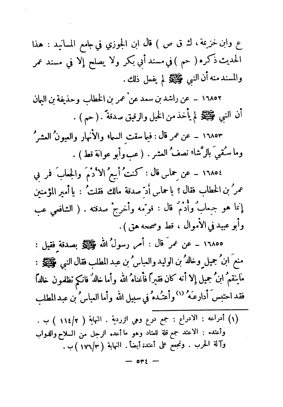16855- عن عمر قال: "أمر رسول الله صلى الله عليه وسلم بصدقة فقيل: منع ابن جميل وخالد بن الوليد والعباس بن عبد المطلب فقال النبي صلى الله عليه وسلم: ما ينقم ابن جميل إلا أنه كان فقيرا فأغناه الله وأما خالد فإنكم تظلمون خالدا فقد احتبس أدراعه 1 وأعتده في سبيل الله وأما العباس بن عبد المطلب