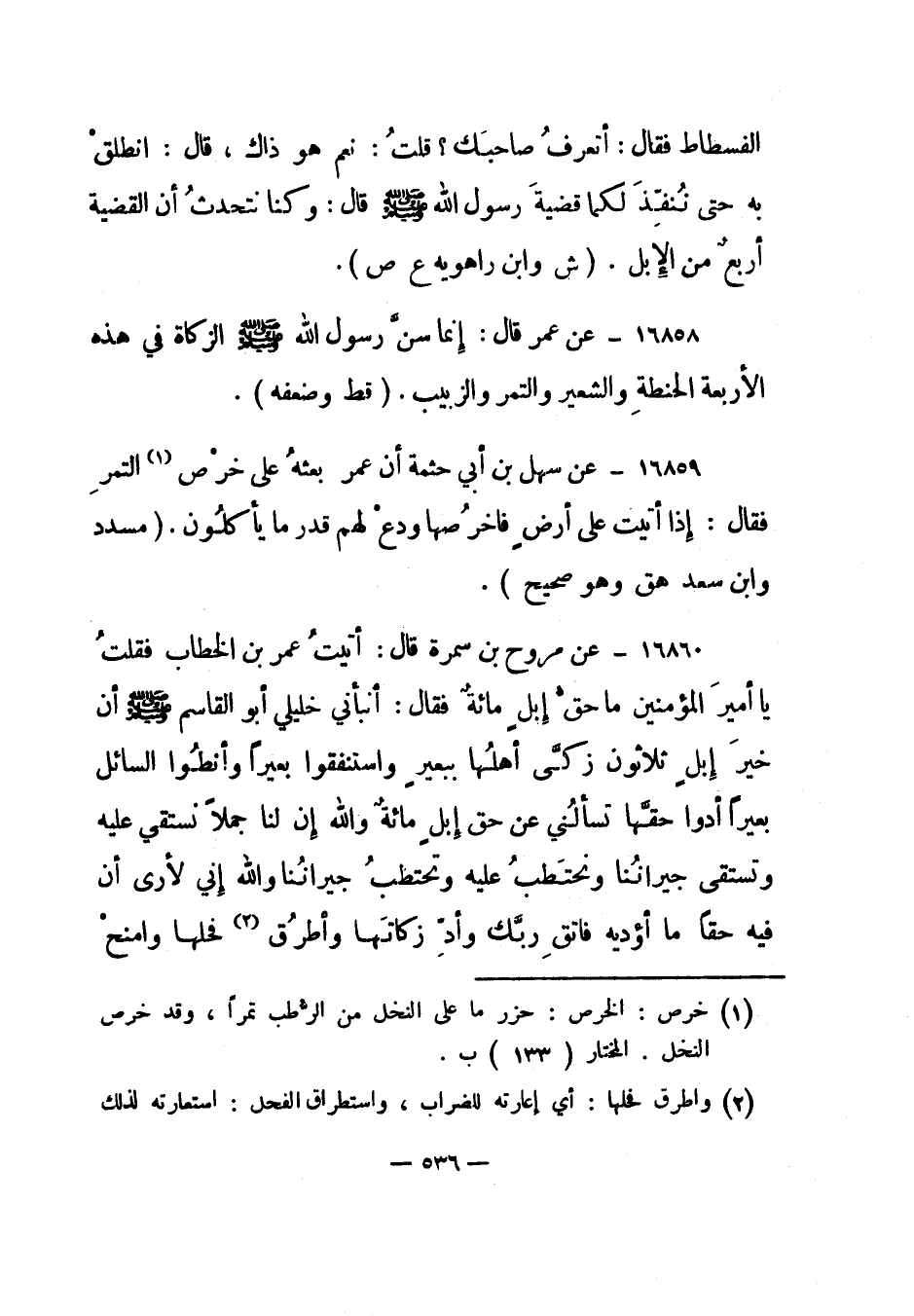 16859- عن سهل بن أبي حثمة "أن عمر بعثه على خرص 1 التمر فقال: إذا أتيت على أرض فاخرصها ودع لهم قدر ما يأكلون". "مسدد وابن سعد هق وهو صحيح".